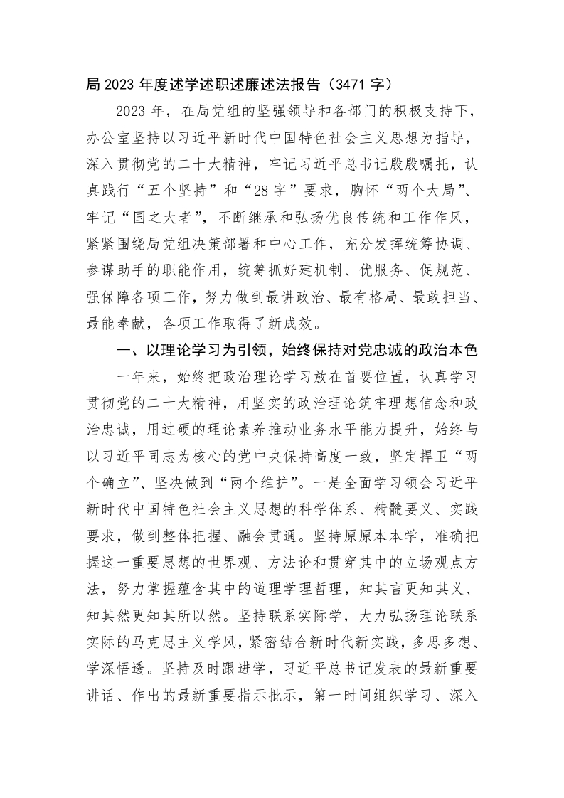 局2023年度述学述职述廉述法报告(3471字)2023年,在局党组的坚强领导和各部门的积极支持下,办公室坚持以习近平新时代中国特色社会主义思想为指导,深入贯彻党的二十大精神,牢记习近平总书记殷殷嘱托,认真践行“五个坚持”和“28字”要求,胸怀“两个大局”、牢记“国之大者”,不断继承和弘扬优良传统和工作作风,紧紧围绕局党组决策部署和中心工作,充分发挥统筹协调、参谋助手的职能作用,统筹抓好建机制、优服务、促规范、强保障各项工作,努力做到最讲政治、最有格局、最敢担当、最能奉献,各项工作取得了新成效。一、以理论学习为引领,始终保持对党忠诚的政治本色一年来,始终把政治理论学习放在首要位置,认真学习贯彻党的二十大精神,用坚实的政治理论筑牢理想信念和政治忠诚,用过硬的理论素养推动业务水平能力提升,始终与以习近平同志为核心的党中央保持高度一致,坚定捍卫“两个确立”、坚决做到“两个维护”。一是全面学习领会习近平新时代中国特色社会主义思想的科学体系、精髓要义、实践要求,做到整体把握、融会贯通。坚持原原本本学,准确把握这一重要思想的世界观、方法论和贯穿其中的立场观点方法,努力掌握蕴含其中的道理学理哲理,知其言更知其义、知其然更知其所以然。坚持联系实际学,大力弘扬理论联系实际的马克思主义学风,紧密结合新时代新实践,多思多想、学深悟透。坚持及时跟进学,习近平总书记发表的最新重要讲话、作出的最新重要指示批示,第一时间组织学习、深入领会、坚决贯彻,做到学习跟进、认识跟进、行动跟进。二是自觉用习近平新时代中国特色社会主义思想改造主观世界,不断增进对党的创新理论的政治认同、思想认同、理论认同、情感认同,做到至信而深厚、融通而致用、执着而笃行。主动把自己的思想摆进去,深刻领会这一重要思想关于坚定理想信念、提升思想境界、加强党性锻炼等一系列要求,始终保持共产党人的政治本色,努力把这一重要思想的世界观、方法论和贯穿其中的立场观点方法变成自己的强大思想武器、科学思想方法,作为研究问题、解决问题的“总钥匙”。坚持真学真信真用、学懂弄通做实,在学出政治忠诚、使命担当、实干精神、深厚情怀、斗争本领、清醒坚定上下功夫,真切感悟党的创新理论的真理力量和实践伟力,使党的创新理论入脑入心,用党的创新理论凝心铸魂。三是坚持学思用贯通、知信行统一,把习近平新时代中国特色社会主义思想转化为坚定理想、锤炼党性和指导实践、推动工作的强大力量。在工作中不断从党的创新理论中悟规律、明方向、学方法、增智慧,把看家本领、兴党本领、强国本领学到手,不断提升政治能力、思维能力、实践能力。同时,力争将这一重要思想运用到深入推进全面从严治党,将焕发出来的学习、工作热情转化为攻坚克难、干事创业的强大动力。二、以履职尽责为核心,统筹推动各项工作取得优异成绩全年坚持围绕局党组中心工作和全市X工作大局忠诚履职尽责,守正创新统筹开展好所分管、所负责的各项工作。