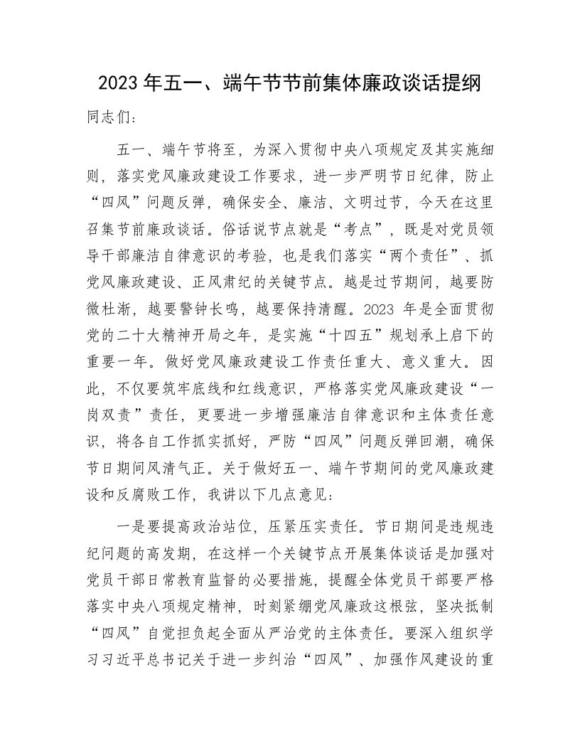 2023年五一、端午节节前集体廉政谈话提纲同志们:五一、端午节将至,为深入贯彻中央八项规定及其实施细则,落实党风廉政建设工作要求,进一步严明节日纪律,防止“四风”问题反弹,确保安全、廉洁、文明过节,今天在这里召集节前廉政谈话。俗话说节点就是“考点”,既是对党员领导干部廉洁自律意识的考验,也是我们落实“两个责任”、抓党风廉政建设、正风肃纪的关键节点。越是过节期间,越要防微杜渐,越要警钟长鸣,越要保持清醒。2023年是全面贯彻党的二十大精神开局之年,是实施“十四五”规划承上启下的重要一年。做好党风廉政建设工作责任重大、意义重大。因此,不仅要筑牢底线和红线意识,严格落实党风廉政建设“一岗双责”责任,更要进一步增强廉洁自律意识和主体责任意识,将各自工作抓实抓好,严防“四风”问题反弹回潮,确保节日期间风清气正。关于做好五一、端午节期间的党风廉政建设和反腐败工作,我讲以下几点意见:一是要提高政治站位,压紧压实责任。节日期间是违规违纪问题的高发期,在这样一个关键节点开展集体谈话是加强对党员干部日常教育监督的必要措施,提醒全体党员干部要严格落实中央八项规定精神,时刻紧绷党风廉政这根弦,坚决抵制“四风”自觉担负起全面从严治党的主体责任。要深入组织学习习近平总书记关于进一步纠治“四风”、加强作风建设的重要指示批示精神,对节日期间纠治“四风”工作及早入手、提前谋划,严抓严管、真抓真管、敢抓敢管,常抓常管,持之以恒抓好作风建设和中央八项规定及其实施细则精神的落实,坚决防止“四风”问题反弹回潮。同时也要有大局意识,把加强节日期间党风廉政建设与疫情防控结合起来,不折不扣执行市疫情防控办的各项要求,进一步压实责任。各级班子成员要严格落实“一岗双责”,扛起抓作风的政治责任,在节日期间深入分管科室、单位进行廉政提醒,确保全局党员干部廉洁过节。各单位负责人要切实担负起全面从严治党的责任,当好压力“传导器”,不仅要廉洁自律,更要增强抓党风廉政建设工作的自觉性,抓好本单位的廉政教育。二是要严格遵规守纪,自觉坚守底线。全局广大党员干部和公职人员要切实增强纪律意识,强化自我约束,严格遵守廉洁自律各项规定,坚决做到执行纪律不打折、不走样、不变通,杜绝“节日腐败”,自觉做到十个“严禁”:严禁公款吃喝、旅游、安排或参与高消费娱乐活动;严禁公款购买赠送节礼,用公款搞相互走访、宴请等活动;严禁违规发放津补贴或实物;严禁违规收受礼品、礼金、消费卡、微信红包等;严禁违规接受管理服务对象的宴请;严禁违规操办婚丧喜庆事宜或借机敛财;严禁公车私用、“私车公养”或借用下属单位、服务对象的车辆;严禁违规参加老乡会、校友会、战友会等;严