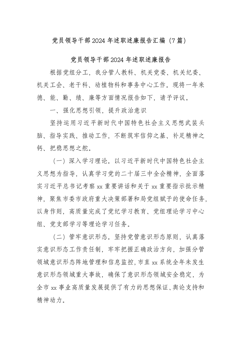 党员领导干部2024年述职述廉报告汇编(7篇)党员领导干部2024年述职述廉报告根据党组分工,我分管人教科、机关党委、机关纪委、机关工会、老干科、动植物科和事务中心工作。现将一年来德、能、勤、绩、廉等方面情况报告如下,请予评议。一、强化思想引领,提升政治意识坚持运用习近平新时代中国特色社会主义思想武装头脑、指导实践、推动工作,不断筑牢信仰之基、补足精神之钙、把稳思想之舵。(一)深入学习理论。以习近平新时代中国特色社会主义思想为指导,认真学习党的二十届三中全会精神,全面落实习近平总书记考察x双重要讲话和关于xx重要指示批示精神,聚焦市委市政府重大决策部署和局党组赋予的使命任务,以身作则,高质量完成了党纪学习教育、党组理论学习中心组、党支部学习等理论学习任务。(二)管牢意识形态。坚持党管意识形态原则,认真落实意识形态工作责任制,牢牢把握正确政治方向,加强分管领域意识形态阵地管理和信息监控,市直燃系统全年未发生意识形态领域重大事故,确保了意识形态领域安全稳定,为全市x事业高质量发展提供了有力的思想保证、舆论支持和精神动力。(三)主动担当作为。坚持做好巡察整改“后半篇文章”深化巡察整改和成果运用,抓住巡察整改契机,健全完善议事决策、公务接待、财务管理、保密等x项制度,顺利接受巡察整改督查评估,被评为“好”等次。针对需长期坚持的整改内容,“一对一”制定整改方案,倒排工期、挂图作战、压茬推进。二、围绕中心任务,忠诚履职尽责坚持围绕中心、服务大局,充分发挥党组织战斗堡垒作用和党员先锋模范作用,着力推动党建与业务互融共进、同向发力。(一)建强党建堡垒。严格执行三会一课、民主评议党员等组织生活制度,加强对党员的教育管理监督;顺利建成x、x、x三市x局“大美x”机关党建联盟;“林长制看x”党建品牌评为市直机关优秀党建品牌,专题宣传片在省市媒体平台展播,品牌影响力持续提升;加强党建带群建,局妇女联合会顺利成立,工会文体活动备受好评。(二)推进清廉建设。抓实党纪学习教育,邀请专家解读了新修订《中国共产党纪律处分条例》,我本人在局“七一”庆祝大会上作了“严守纪律规矩筑牢底线意识永葆廉洁本色”廉政党课报告。坚持以文化育廉、以活动促廉,确保清风常吹、正气常在,今年以来开展了“树清廉家风建廉洁家庭创清廉xx”党员践诺承诺、“厚植爱国情怀涵养清廉家风”主题党日、