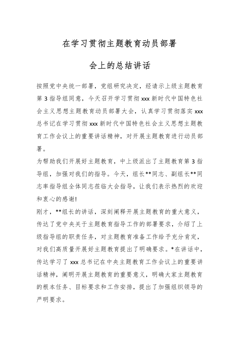 在学习贯彻主题教育动员部署会上的总结讲话按照党中央统一部署,党组研究决定,经请示上级主题教育第3指导组同意,今天召开学习贯彻xx新时代中国特色社会主义思想主题教育动员部署大会,认真学习贯彻落实xx总书记在学习贯彻xx新时代中国特色社会主义思想主题教育工作会议上的重要讲话精神,对开展主题教育进行动员部署。为帮助我们开展好主题教育,中上级派出了主题教育第3指导组,加强对我们的指导。今天,组长*同志、副组长**同志率指导组全体同志莅临大会指导,让我们表示热烈的欢迎和衷心的感谢!刚才,**组长的讲话,深刻阐释开展主题教育的重大意义,传达了党中央关于主题教育指导工作的部署要求,介绍了上级指导组的职责任务,对主题教育准备工作给予充分肯定,对我们高质量开展好主题教育提出了明确要求。*在讲话中,传达学习了xxx总书记在中央主题教育工作会议上的重要讲话精神,阐明开展主题教育的重要意义,明确大家主题教育的根本任务、目标要求和工作安排,提出了加强组织领导的严明要求。两位领导同志的讲话,具有很强的政治性、思想性和指导性,既是一次全面的动员部署,也是一堂生动的党课,使我们提高了政治站位,明确了努力方向,坚定了搞好这次主题教育的信心和决心。**总经理宣布了主题教育指导组组成及分工,会后就可以对接,建立联系机制。以今天的大会为标志,主题教育正式拉开序幕。下面,就贯彻落实领导同志讲话精神,切实抓紧抓实主题教育工作,讲3点具体意见。一、高标准做好主题教育准备工作。首批单位党委要迅速行动起来,抓紧做好主题教育各项准备工作,以更高的站位、更充分的准备,确保主题教育的高标准。一要迅速抓好传达学习。各级党委要采取“第一议题”、中心组学习等形式,传达学习xx总书记在中央主题教育工作会议上的重要讲话精神,传达学习*组长讲话精神,教育引导各级领导人员和广大党员把思想和行动统一到党中央决策部署上来,统一到党组部署要求上来,增强做好主题教育的政治自觉、思想自觉和行动自觉。二要认真研究制定方案。一揽子工作方案,是搞好主题教育的规划书也是作战图。首批单位党委要吃透党中央精神,吃透党组实施意见。在此基础上,认真研究制定本单位主题教育实施方案,明确开展主题教育的时间进度、目标任务、方法步骤等,为搞好主题教育铺好路线图。要认真研究制定本级领导班子工作方案,从谋划部署、理论学习、