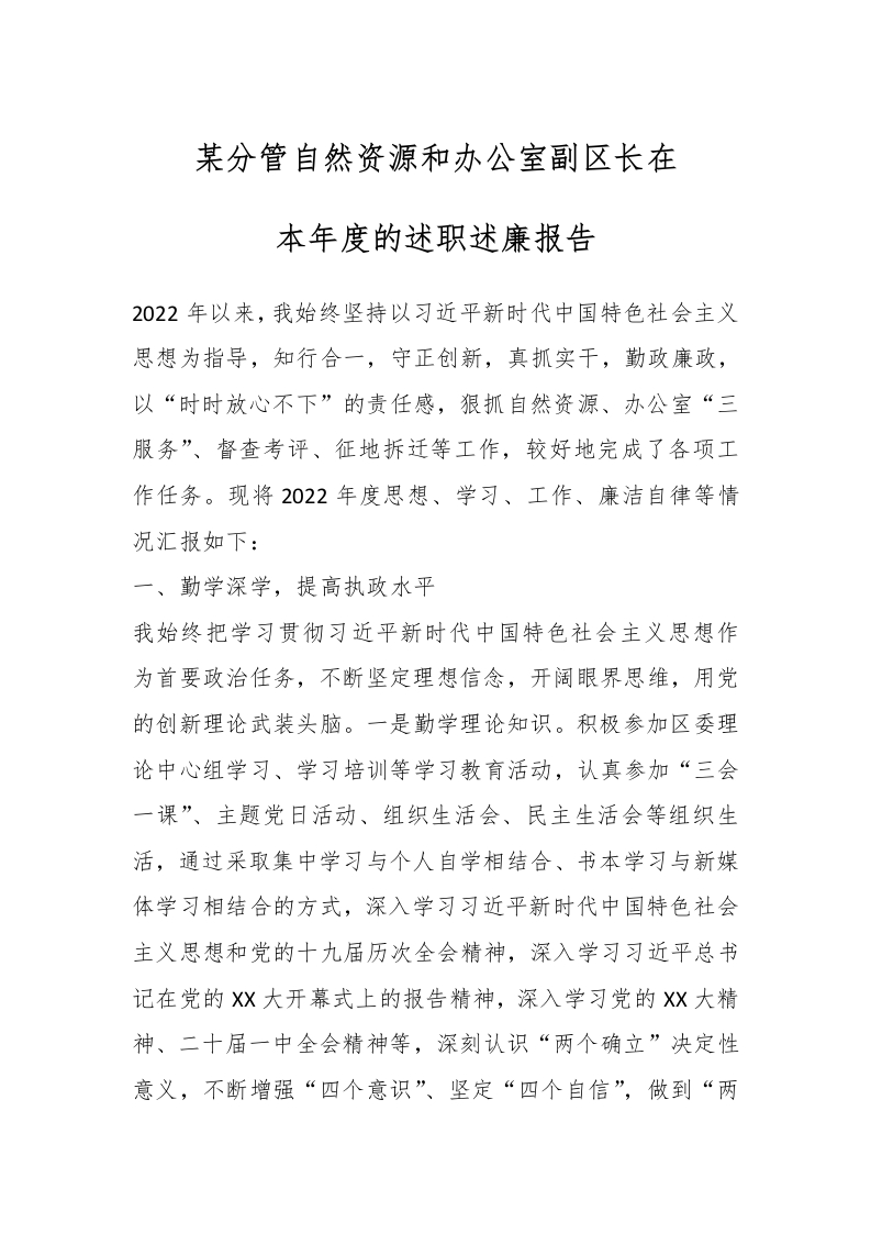 某分管自然资源和办公室副区长在本年度的述职述廉报告2022年以来,我始终坚持以习近平新时代中国特色社会主义思想为指导,知行合一,守正创新,真抓实干,勤政廉政,以“时时放心不下”的责任感,狠抓自然资源、办公室“三服务”、督查考评、征地拆迁等工作,较好地完成了各项工作任务。现将2022年度思想、学习、工作、廉洁自律等情况汇报如下:一、勤学深学,提高执政水平我始终把学习贯彻习近平新时代中国特色社会主义思想作为首要政治任务,不断坚定理想信念,开阔眼界思维,用党的创新理论武装头脑。一是勤学理论知识。积极参加区委理论中心组学习、学习培训等学习教育活动,认真参加“三会一课”、主题党日活动、组织生活会、民主生活会等组织生活,通过采取集中学习与个人自学相结合、书本学习与新媒体学习相结合的方式,深入学习习近平新时代中国特色社会主义思想和党的十九届历次全会精神,深入学习习近平总书记在党的X大开幕式上的报告精神,深入学习党的X大精神、二十届一中全会精神等,深刻认识“两个确立”决定性意义,不断增强“四个意识”、坚定“四个自信”,做到“两个维护”。二是深学业务知识。到分管的区委区政府办公室、市自然资源X分局以及联系的X社区进行党的X大精神宣讲。有针对性地加强了自然资源、办公室管理、督查考评、征地拆迁等业务知识学习,加强自学,不断提升做好工作的业务能力和水平。二、守正创新,扎实推进工作围绕加快建设X先行试验区,我努力做到狠抓重点、攻坚难点、突破要点,全力做好自然资源、征地拆迁、办公室“三服务”、督查绩效等工作,各项工作取得有效进展。(一)锐意进取,自然资源工作成效显著。一是耕地保护工作有力推进。全面贯彻落实耕地保护“田长制”,积极推进耕地进出平衡工作,实现农村乱占耕地建房问题零新增,基本农田保护得到进一步落实,严守耕地红线,耕地保护责任制得到进一步落实。组织成立21个工作专班,创新了采取出租、入股等方式流转土地经营权方式,推进了21个社区耕地撂荒全部摸底,完成整治撂荒3274.24亩,同比增长87.41%。二是自然资源要素有力保障。加大土地综合整治力度,积极推进“旱改水”项目,完成报备入库项目1个,完成32亩水田验收报备入库,购买补充耕地199.48亩,完成市下达任务130亩的178.06%。三是用地报批工作高效开展。积极向上级汇报,做好对接沟通协调,加大争取力度,加强X建设用地报批工作指导,为各个项目用地报批提供支持,为项目