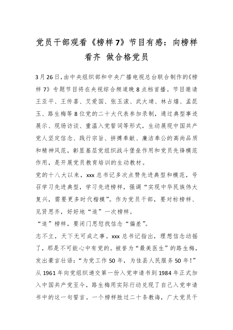 党员干部观看《榜样7》节目有感:向榜样看齐做合格党员3月26日,由中央组织部和中央广播电视总台联合制作的《榜样7》专题节目将在央视综合频道晚8点档首播。节目邀请王亚平、王传喜、艾爱国、张玉滚、武大靖、林占熺、孟昆玉、路生梅等8位党的二十大代表参加录制,通过典型事迹展示、现场访谈、重温入党誓词等形式,生动展现中国共产党人坚定信念、践行宗旨、拼搏奉献、廉洁奉公的高尚品质和精神风范,彰显基层党组织战斗堡垒作用和党员先锋模范作用,是开展党员教育培训的生动教材。党的十八大以来,xx总书记多次点赞先进典型和模范,号召学习先进典型,学习先进榜样,强调“实现中华民族伟大复兴,需要更多时代楷模”。作为党员干部,要对标榜样、见贤思齐,好好地“追”一次榜样。“追”榜样,要闭门思愆找信念“偏差”。志不立,天下无可成之事。xx总书记指出,理想信念动摇了,那是不可能心中有党的。被誉为“最美医生”的路生梅,发出豪言壮语:“为党工作50年,为佳县人民服务50年!”从1961年向党组织递交第一份入党申请书到1984年正式加入中国共产党至今,路生梅用实际行动兑现了自己入党申请书中的这一句誓言。一个榜样胜过二十条教诲,广大党员干部既要学习榜样的精神,以坚定理想信念为根基,挺起精神脊梁,敢于直面前进路上的威胁、挑战、诱惑,充分相信中国共产党“能”、马克思主义“行”、中国特色社会主义道路“好”,也要从中汲取奋进力量,把崇高理想信念和道德品质追求转化为具体行动,体现在平凡的工作生活中,做出自己应有的贡献,把榜样的精神和力量代代传承下去。“追”榜样,要三省吾身找担当“落差”。xx总书记多次强调担当精神,他指出:“责任担当是领导干部必备的基本素质,干部就要有担当,有多大担当才能干多大事业,尽多大责任才会有多大成就。”“乡村教育守望者”张玉滚作为一名共产党员和人民教师,扎根偏僻山村,矢志不渝奋斗在基层教育一线,用坚守和奉献在平凡的岗位上书写着出彩的人生,是学生健康成长的指导者和引路人,是新时代“四有”教师的模范,是共产党员“不忘初心、牢记使命”的标杆,更是全社会学习的榜样。榜样们无一不是把勇于担当落实到每一个岗位、每一次逆行上,才换来了山河无恙,才有你我的“家人闲坐,灯火可亲”。要不断从榜样中汲取敢想、敢做、敢当的力量,时刻牢记责任重于泰山的意识,对工作任劳任怨、尽心竭力、善始善终、善作善成,做新时代的“劲草、真金”。“追”榜样,要反求诸己找实干“误差”。古人曰:“道虽迩,不行不至;事虽小,不为不成”。站岗打手势只是交警的基本功,过路行人习以为常。而北京市公安局公安交通管理局