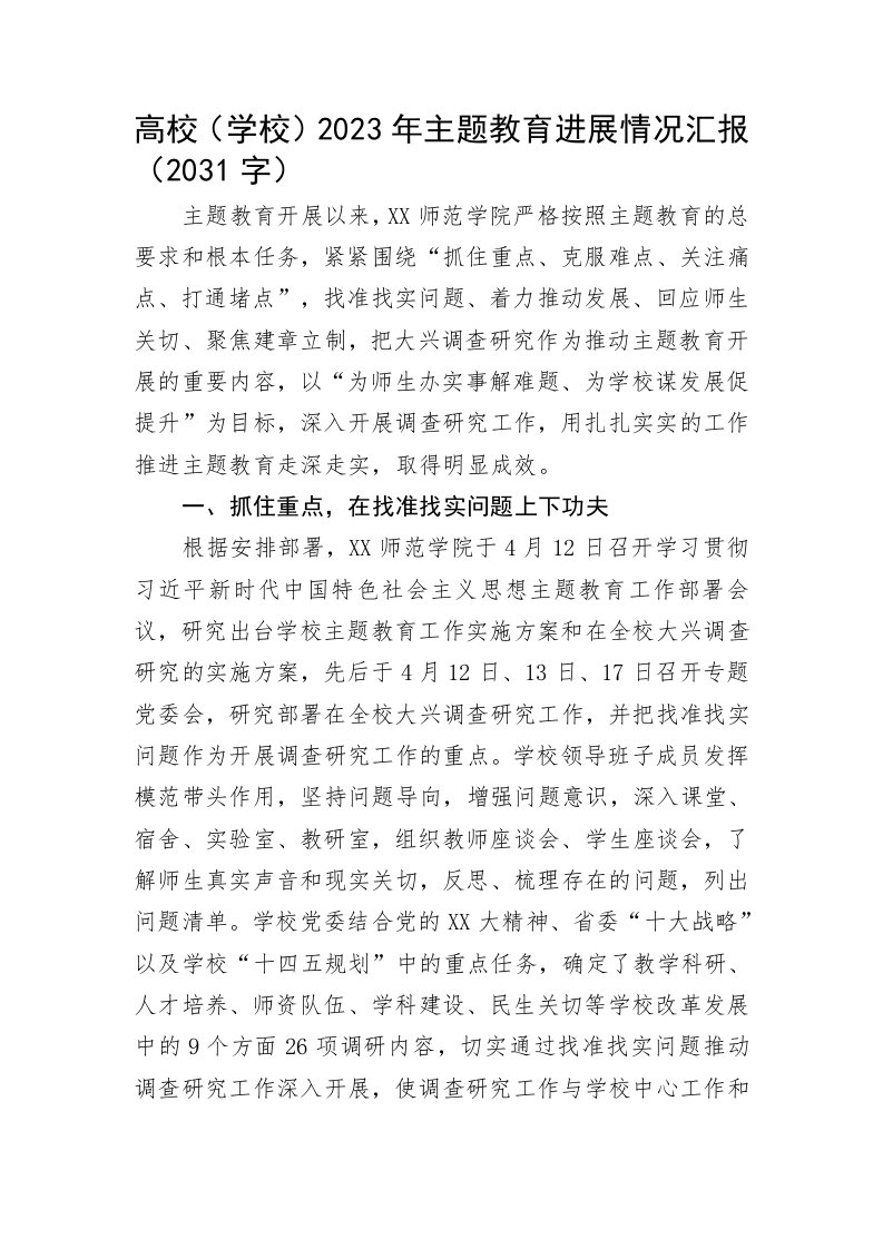 高校(学校)2023年主题教育进展情况汇报(2031字)主题教育开展以来,X师范学院严格按照主题教育的总要求和根本任务,紧紧围绕“抓住重点、克服难点、关注痛点、打通堵点”,找准找实问题、着力推动发展、回应师生关切、聚焦建章立制,把大兴调查研究作为推动主题教育开展的重要内容,以“为师生办实事解难题、为学校谋发展促提升”为目标,深入开展调查研究工作,用扎扎实实的工作推进主题教育走深走实,取得明显成效。一、抓住重点,在找准找实问题上下功夫根据安排部署,XX师范学院于4月12日召开学习贯彻习近平新时代中国特色社会主义思想主题教育工作部署会议,研究出台学校主题教育工作实施方案和在全校大兴调查研究的实施方案,先后于4月12日、13日、17日召开专题党委会,研究部署在全校大兴调查研究工作,并把找准找实问题作为开展调查研究工作的重点。学校领导班子成员发挥模范带头作用,坚持问题导向,增强问题意识,深入课堂、宿舍、实验室、教研室,组织教师座谈会、学生座谈会,了解师生真实声音和现实关切,反思、梳理存在的问题,列出问题清单。学校党委结合党的XX大精神、省委“十大战略”以及学校“十四五规划”中的重点任务,确定了教学科研、人才培养、师资队伍、学科建设、民生关切等学校改革发展中的9个方面26项调研内容,切实通过找准找实问题推动调查研究工作深入开展,使调查研究工作与学校中心工作和决策需要紧密结合,不断推动学校事业发展。二、克服难点,在着力推动发展上下功夫围绕大兴调查研究实施方案确立的调研内容,学校将目光聚焦于“事业高质量发展”,将力量集中于“核心指标”,通过解决学校发展中的重大难点问题,提升推动学校发展。围绕学校“特色办学”这一核心指标,主动将彰显甲骨文办学特色作为领导班子领题调研的重要内容,用习近平总书记视察河南XX讲话精神指导学校的办学实践和改革发展,积极推动甲骨文特色办学再上新台阶再上新水平,政策上给予支持,资金上进行倾斜,持续加强“甲骨文信息处理”教育部重点实验室、甲骨文信息处理特色骨干学科建设,不断提升甲骨文大数据平台“殷契文渊”的影响力,积极推动与腾讯科技开展甲骨文数字合作,着力推进甲骨文活化利用艺术中心项目建设。围绕“硕士学位授权点扩容增量”这一重点工作,学校将其作为一项重要调研内容,聚焦关键核心指标,精心做好申报前期工作,以久久为功的战略定力和时不我待的紧迫感,力争实现硕士学位授权点有较大的扩容增量。学校调查研究工作不驰于空想、不骛于虚声,聚焦于核心指标和重大战略,着力推动高质量发展。三、关注痛点,在回应师生关切上下功夫学校根据大兴调查研究实施方案,始终关注事业发展的“痛点”,积极回应师生关切,并把工作是否取得实效、师生是否满意作为检验调查研究和主题教育成效的重要方法,以最大的诚意主动接受师生监督,真正把工作做到师生的心