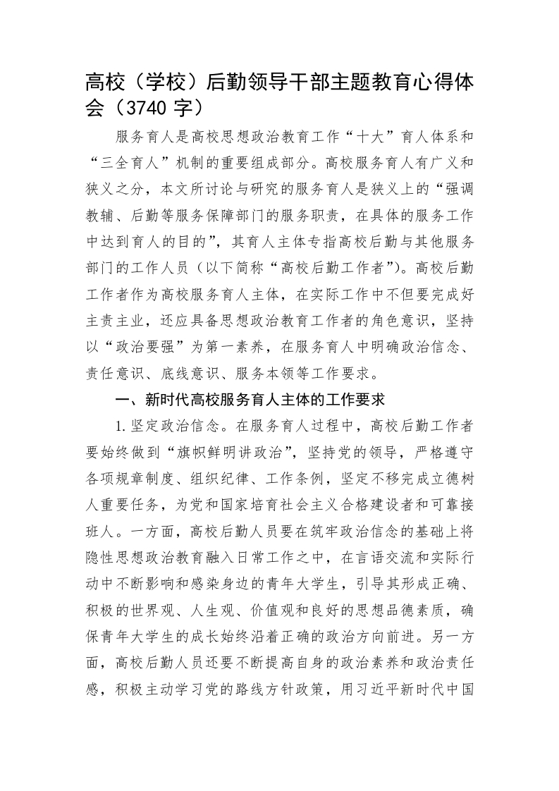 高校(学校)后勤领导干部主题教育心得体会(3740字)服务育人是高校思想政治教育工作“十大”育人体系和“三全育人”机制的重要组成部分。高校服务育人有广义和狭义之分,本文所讨论与研究的服务育人是狭义上的“强调教辅、后勤等服务保障部门的服务职责,在具体的服务工作中达到育人的目的”,其育人主体专指高校后勤与其他服务部门的工作人员(以下简称“高校后勤工作者”)。高校后勤工作者作为高校服务育人主体,在实际工作中不但要完成好主责主业,还应具备思想政治教育工作者的角色意识,坚持以“政治要强”为第一素养,在服务育人中明确政治信念、责任意识、底线意识、服务本领等工作要求。一、新时代高校服务育人主体的工作要求1.坚定政治信念。在服务育人过程中,高校后勤工作者要始终做到“旗帜鲜明讲政治”,坚持党的领导,严格遵守各项规章制度、组织纪律、工作条例,坚定不移完成立德树人重要任务,为党和国家培育社会主义合格建设者和可靠接班人。一方面,高校后勤人员要在筑牢政治信念的基础上将隐性思想政治教育融入日常工作之中,在言语交流和实际行动中不断影响和感染身边的青年大学生,引导其形成正确、积极的世界观、人生观、价值观和良好的思想品德素质,确保青年大学生的成长始终沿着正确的政治方向前进。另一方面,高校后勤人员还要不断提高自身的政治素养和政治责任感,积极主动学习党的路线方针政策,用习近平新时代中国特色社会主义思想武装头脑,铸就忠诚、担当的政治品格,确保政治信念的坚定、稳固。2.增强责任意识。责任意识是高校后勤工作者的基本素质。增强责任意识就是要有“时时放心不下”的责任感,在工作中始终牢记个人职责与集体责任,不仅要对自己负责,更要对集体、对青年大学生负责。为保障和推进服务育人机制的运行,高校后勤工作者必须始终坚持责任意识,以提供常态化、全方位、高质量的校园后勤保障服务为基本责任,把服务育人放在日常工作中的重要位置,用细致入微的关怀感动学生,用无私奉献的精神感化学生,用以身作则的态度影响学生,积极和其他高校思想政治教育育人主体协同配合,形成育人合力,共同营造更加活泼温暖的校园氛围和安全稳定的校园秩序。3.树牢底线意识。习近平总书记指出,“我们要坚持底线思维、增强忧患意识,有效防范和化解前进道路上的各种风险”。对高校后勤工作者来说,树牢底线意识就是要在实际工作中时刻对一切可能影响高校校园安全的风险因素保持高度警惕,并主动对其进行预警、评估与处理。树立牢固的底线意识是高校后勤工作者的基本要求,是维护高校校园安全的重要保证。在服务育人中,高校后勤工作者需要“双肩挑”“两手抓”,不仅要保护好师生的人身财产安全,还要肩负起维护意识形态领域安全的重任。高校后勤工作者要不断增强底线意识,积极应对和化解意识形态领域中存在的各种风险与挑战,为高校教学工作的顺利开展和育人机制的有
