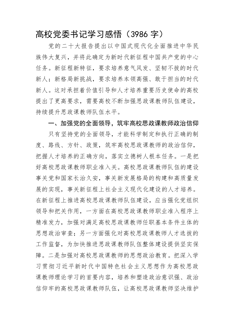 高校党委书记学习感悟(3986字)党的二十大报告提出以中国式现代化全面推进中华民族伟大复兴,并将此确定为新时代新征程中国共产党的中心任务。新征程新特征,要求培养意气风发、坚韧不拔的时代新人;新格局新挑战,要求培养本领高强、敢于担当的时代新人。这对承担着价值引导和人才培养重要历史使命的高校提出了更高要求,需要高校不断加强思政课教师队伍建设,持续提升思政课教师队伍水平。一、加强党的全面领导,筑牢高校思政课教师政治信仰只有坚持党的全面领导,才能科学制定和执行正确的制度、路线、方针、政策,筑牢高校思政课教师的政治信仰,把握人才培养的正确方向,落实立德树人根本任务。一是把好高校思政课教师职业准入关。高校思政课教师队伍的建设事关党和国家长治久安,事关新发展格局的构建和高质量发展的实现,事关新征程上社会主义现代化建设的人才培养。在新征程上推进高校思政课教师队伍建设,应当强化党组织领导和把关作用,一方面在高校思政课教师职业准入程序上精准发力,加强对满足高校思政课教师任职基本条件主体的思想政治审查;另一方面强化对高校思政课教师人才选拔的工作监督,为加快推进思政课教师队伍整体建设提供坚实保障。二是加强对高校思政课教师的思想政治教育。把深入学习贯彻习近平新时代中国特色社会主义思想作为高校思政课教师理论学习的首要内容,培养和塑造政治意识强、政治信仰牢的高校思政课教师队伍,让高校思政课教师坚决维护党中央权威和集中统一领导,切实增强拥护“两个确立”“两个维护”的思想自觉、政治自觉、行动自觉,并将其转化为铸魂育人的实际行动。三是强化党对高校思政课教师队伍的政治监督。鉴于高校思政课教师“思想政治教育者”的职业角色,坚持党对高校思政课教师队伍的集中统一领导,必须强化政治监督,督促高校思政课教师增强维护党中央权威和集中统一领导的政治自觉,加强对当代大学生思想的正确引导和法治素养的培育,确保能够培养德智体美劳全面发展的社会主义建设者和接班人。二、改革高校思政课教师评价体系,落实师德师风第一标准改革高校思政课教师评价体系,需以习近平总书记“四个相统一”重要论述为指引,落实师德师风第一标准。“四个相统一”,意味着高校思政课教师应当运用好课堂教学的主渠道,以知识为载体,寓价值引导于知识讲授,做到坚持教书和育人相统一;在教育教学活动中传播知识、传递思想和坚定信仰的同时,严格自我要求,做好学生道德品行、知识储备、创新思维和奉献精神等方面的“引路人”,坚持言传和身教相统一;通过深潜其心、精研教学,把学生在学习中遇到的难题讲清楚讲透彻,与此同时,关注世情、国情、社情、民情,不断更新教学内容、常讲常新,扎根社会实践,做到坚持潜心问道和关注社会相统一;能够在教学实践以及社会实践等活动中产生思考并结合学科,自由探求学术真理,并在学术研究中恪守学术规范,为教师整体学术研究的健康良性发展贡献力量,做到坚持学术自由和学术规范相统一。
