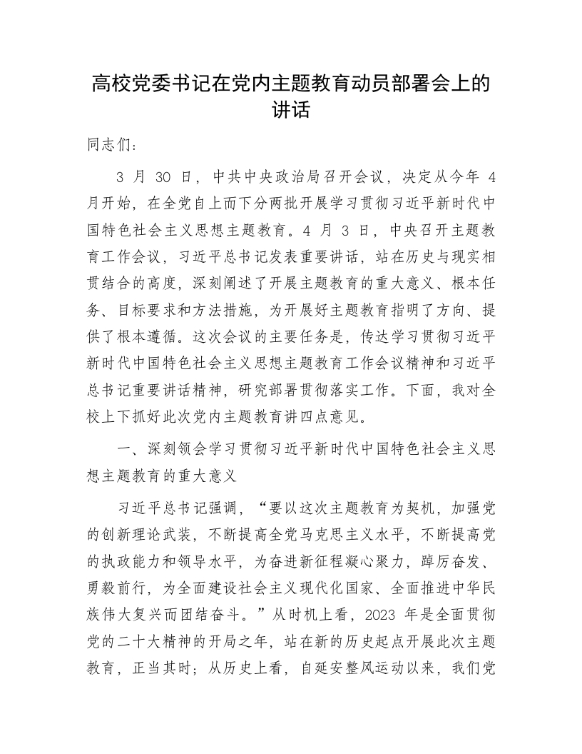 高校党委书记在党内主题教育动员部署会上的讲话同志们:3月30日,中共中央政治局召开会议,决定从今年4月开始,在全党自上而下分两批开展学习贯彻习近平新时代中国特色社会主义思想主题教育。4月3日,中央召开主题教育工作会议,习近平总书记发表重要讲话,站在历史与现实相贯结合的高度,深刻阐述了开展主题教育的重大意义、根本任务、目标要求和方法措施,为开展好主题教育指明了方向、提供了根本遵循。这次会议的主要任务是,传达学习贯彻习近平新时代中国特色社会主义思想主题教育工作会议精神和习近平总书记重要讲话精神,研究部署贯彻落实工作。下面,我对全校上下抓好此次党内主题教育讲四点意见。一、深刻领会学习贯彻习近平新时代中国特色社会主义思想主题教育的重大意义习近平总书记强调,“要以这次主题教育为契机,加强党的创新理论武装,不断提高全党马克思主义水平,不断提高党的执政能力和领导水平,为奋进新征程凝心聚力,踔厉奋发、勇毅前行,为全面建设社会主义现代化国家、全面推进中华民族伟大复兴而团结奋斗。”从时机上看,2023年是全面贯彻党的二十大精神的开局之年,站在新的历史起点开展此次主题教育,正当其时;从历史上看,自延安整风运动以来,我们党开展的历次集中教育活动,都以思想教育、理论学习打头。这次主题教育,是贯彻落实党的二十大精神的重大举措。搞好这次主题教育,对于统一全党思想、解决党内存在的突出问题、始终保持党同人民群众血肉联系、推动党和国家事业发展,具有重要意义。第一,开展学习贯彻习近平新时代中国特色社会主义思想主题教育,是统一全党思想意志行动、始终保持党的强大凝聚力战斗力的必然要求。我们党自成立之日起,就鲜明地将马克思主义写在自己的旗帜上。正是在马克思主义及其中国化理论成果指引下,中国共产党从成立初期只有几十人的小党成长壮大为拥有9000多万党员、在14亿多人的中国长期执政的大党,中华民族迎来了从站起来、富起来到强起来的伟大飞跃,迎来了实现中华民族伟大复兴的光明前景。回首党的历史,历史庄严宣示,思想建党、理论强党是保持党的先进性纯洁性、增强党的创造力凝聚力战斗力的必然要求。习近平新时代中国特色社会主义思想是当代中国马克思主义、21世纪马克思主义,这是我们党第一次用“世纪”尺度来定位党的创新理论。学习贯彻习近平新时代中国特色社会主义思想是新时代新征程开创事业发展新局面的根本要求。新征程上,面对错综复杂的国际国内形势、艰巨繁重的改革发展稳定任务、各种不确定难预料的风险挑战,要实现党的二十大确定的战略目标,迫切需要广大党员、干部特别是各级领导干部进一步深入学习