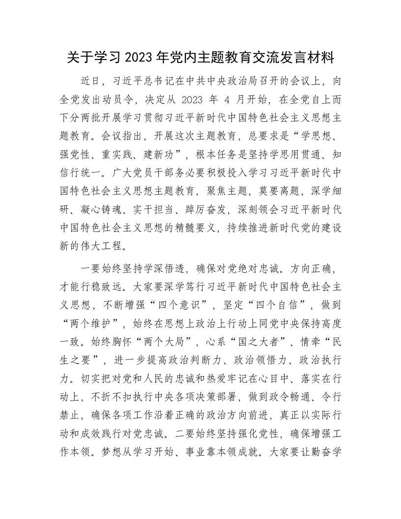 关于学习2023年党内主题教育交流发言材料近日,习近平总书记在中共中央政治局召开的会议上,向全党发出动员令,决定从2023年4月开始,在全党自上而下分两批开展学习贯彻习近平新时代中国特色社会主义思想主题教育。会议指出,开展这次主题教育,总要求是“学思想、强党性、重实践、建新功”,根本任务是坚持学思用贯通、知信行统一。广大党员干部务必要积极投入学习习近平新时代中国特色社会主义思想主题教育,聚焦主题,莫要离题,深学细研、凝心铸魂、实干担当、踔厉奋发,深刻领会习近平新时代中国特色社会主义思想的精髓要义,持续推进新时代党的建设新的伟大工程。一要始终坚持学深悟透,确保对党绝对忠诚。方向正确,才能行稳致远。大家要深学笃行习近平新时代中国特色社会主义思想,不断增强“四个意识”,坚定“四个自信”,做到“两个维护”,始终在思想上政治上行动上同党中央保持高度一致。始终胸怀“两个大局”,心系“国之大者”、情牵“民生之要”,进一步提高政治判断力、政治领悟力、政治执行力。切实把对党和人民的忠诚和热爱牢记在心目中、落实在行动上,不折不扣执行中央各项决策部署,做到政令畅通、令行禁止,确保各项工作沿着正确的政治方向前进,真正以实际行动和成效践行对党忠诚。二要始终坚持强化党性,确保增强工作本领。梦想从学习开始、事业靠本领成就。大家要让勤奋学习成为事业远航的动力,让增长本领成为持续搏击的能量。要把学习作为一种追求、一种爱好、一种习惯、一种健康的生活方式,沉得住气,静下心来,舍得花精力,肯下苦功夫,认认真真、踏踏实实、孜孜不倦加强学习,既勤于从书本中汲取智慧和营养,又善于从实践中深化认识和理解,还要虚心向人民群众学习请教,坚持在干中学、学中干,不断丰富知识储备、优化知识结构、提升治理水平,努力锻造与承担职责相匹配的工作能力,全面提升干事创业的本领,努力成为熟练掌握政策规定、能够做好本职工作的行家里手。三要始终坚持注重实践,确保勇于担当作为。干事创业,是干部的职责所在。大家要抓紧时间熟悉职能业务和单位各方面情况,尽快进入角色、上心上手,切实把各项工作承接好、开展好。始终把人民放在心中最高位置,深入践行以人民为中心的发展思想,坚持人民至上、发展为民,以群众呼声为第一信号,以群众需要为第一选择,以群众满意为第一标准,视群众为“家人”、视群众事为“自己事”、视群众盼为“我之求”,敢于直面矛盾难题,敢于承担急难险重任务,真正把心思和精力用到干工作、抓落实、创事业上,用心用情用力办好民生实事,解决好群众急难愁盼问题,努力在担当作为中践行初心使命,切实为人民服务。四要始终坚持建功立业,确保凝聚强大合力。团结产生力量,一定要精诚团结,努力开创工作新局面。大家要珍视班子团结,注重统筹协调和民主决策,和