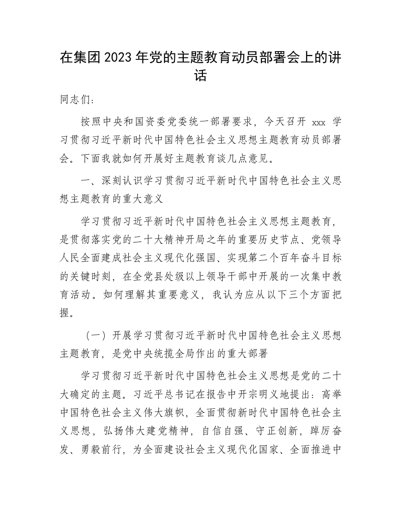 在集团2023年党的主题教育动员部署会上的讲话同志们:按照中央和国资委党委统一部署要求,今天召开xx学习贯彻习近平新时代中国特色社会主义思想主题教育动员部署会。下面我就如何开展好主题教育谈几点意见。一、深刻认识学习贯彻习近平新时代中国特色社会主义思想主题教育的重大意义学习贯彻习近平新时代中国特色社会主义思想主题教育,是贯彻落实党的二十大精神开局之年的重要历史节点、党领导人民全面建成社会主义现代化强国、实现第二个百年奋斗目标的关键时刻,在全党县处级以上领导干部中开展的一次集中教育活动。如何理解其重要意义,我认为应从以下三个方面把握。(一)开展学习贯彻习近平新时代中国特色社会主义思想主题教育,是党中央统揽全局作出的重大部署学习贯彻习近平新时代中国特色社会主义思想是党的二十大确定的主题。习近平总书记在报告中开宗明义地提出:高举中国特色社会主义伟大旗帜,全面贯彻新时代中国特色社会主义思想,弘扬伟大建党精神,自信自强、守正创新,踔厉奋发、勇毅前行,为全面建设社会主义现代化国家、全面推进中华民族伟大复兴而团结奋斗。深刻阐述了新时代新征程中国共产党的使命任务,就是就是团结带领全国各族人民全面建成社会主义现代化强国、实现第二个百年奋斗目标,以中国式现代化全面推进中华民族伟大复兴。二十大之所以确定这一主题,是因为新中国经过70多年发展,特别是经过新时代十年的高质量发展,我国已成为世界第二大经济体、制造业第一大国、货物贸易第一大国、外汇储备第一大国,到了具备一定实力易滋生自满情绪的时候;是因为从党的二十大到2035年,是全面建成社会主义现代化强国分两步走的关键节点,实现中华民族伟大复兴的目标近在眼前,全面建设社会主义现代化国家新征程即将开启,中国特色社会主义事业到了船到中流浪更急、人到半山路更陡的时候;是因为世界正处于百年未有之大变局,美国等敌对势力千方百计遏制我国发展,周边环境又有很多不确定因素。在我国面临复杂的内外环境、重要的历史节点,习近平总书记告诫:“全党同志务必不忘初心、牢记使命,务必谦虚谨慎、艰苦奋斗,务必敢于斗争、善于斗争,坚定历史自信,增强历史主动,谱写新时代中国特色社会主义更加绚丽的华章。”党的二十大把学习贯彻习近平新时代中国特色社会主义思想确定为主题,充分体现了以习近平同志为核心的党中央具有的高度政治清醒和历史自觉。开展学习贯彻习近平新时代中国特色社会主义思想主题教育是党中央统揽全局作出的重要决定。中国特色社会主义是前