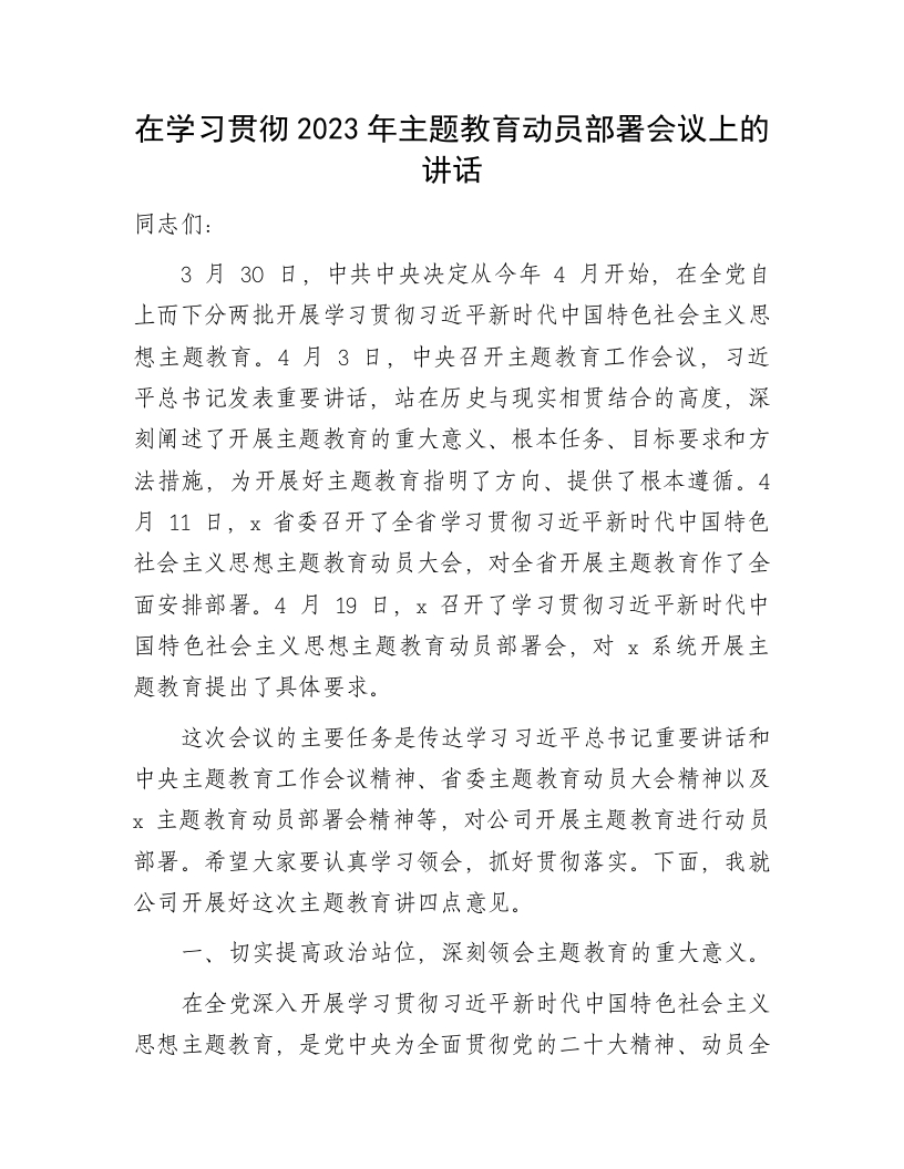 在学习贯彻2023年主题教育动员部署会议上的讲话同志们:3月30日,中共中央决定从今年4月开始,在全党自上而下分两批开展学习贯彻习近平新时代中国特色社会主义思想主题教育。4月3日,中央召开主题教育工作会议,习近平总书记发表重要讲话,站在历史与现实相贯结合的高度,深刻阐述了开展主题教育的重大意义、根本任务、目标要求和方法措施,为开展好主题教育指明了方向、提供了根本遵循。4月11日,x省委召开了全省学习贯彻习近平新时代中国特色社会主义思想主题教育动员大会,对全省开展主题教育作了全面安排部署。4月19日,x召开了学习贯彻习近平新时代中国特色社会主义思想主题教育动员部署会,对x系统开展主题教育提出了具体要求。这次会议的主要任务是传达学习习近平总书记重要讲话和中央主题教育工作会议精神、省委主题教育动员大会精神以及x主题教育动员部署会精神等,对公司开展主题教育进行动员部署。希望大家要认真学习领会,抓好贯彻落实。下面,我就公司开展好这次主题教育讲四点意见。一、切实提高政治站位,深刻领会主题教育的重大意义。在全党深入开展学习贯彻习近平新时代中国特色社会主义思想主题教育,是党中央为全面贯彻党的二十大精神、动员全党同志为完成党的中心任务而团结奋斗所作的重大部署,是深入推进新时代党的建设新的伟大工程的重大部署。开展好这次主题教育,我们要深刻学习领会习近平总书记重要讲话精神,把握精神实质,自觉把思想和行动统一到以习近平同志为核心的党中央部署要求上来。要深刻领会开展主题教育是统一全党思想意志行动,始终保持党的强大凝聚力、战斗力的必然要求。我们党是高度集中统一的马克思主义政党,思想上的统一、政治上的团结、行动上的一致,是党的事业不断发展壮大的根本所在。党的十八大以来,习近平总书记对统一全党思想意志行动的重大意义作出了系列重要论述。只有全党思想和意志统一了,才能统一全国各族人民思想和意志,才能形成推进改革的强大合力。推动公司高质量发展行稳致远,需要我们以真理之光照亮前行之路,用党的创新理论统一思想、统一意志、统一行动,汇聚起奋进新征程、建功新时代的强大合力。各级党组织和全体党员要把开展主题教育作为重大政治任务,不断提高政治判断力、政治领悟力、政治执行力,始终在思想上政治上行动上同以习近平同志为核心的党中央保持高度一致,衷心拥护“两个确立”、忠诚践行“两个维护”。要深刻领会开展主题教育是推动全党积极担当作为,不断开创事业发展新局面的必然要求。习近平总书记强调,要实干担当促进发展,教育引导广大党员、干部胸怀“国之大者”,