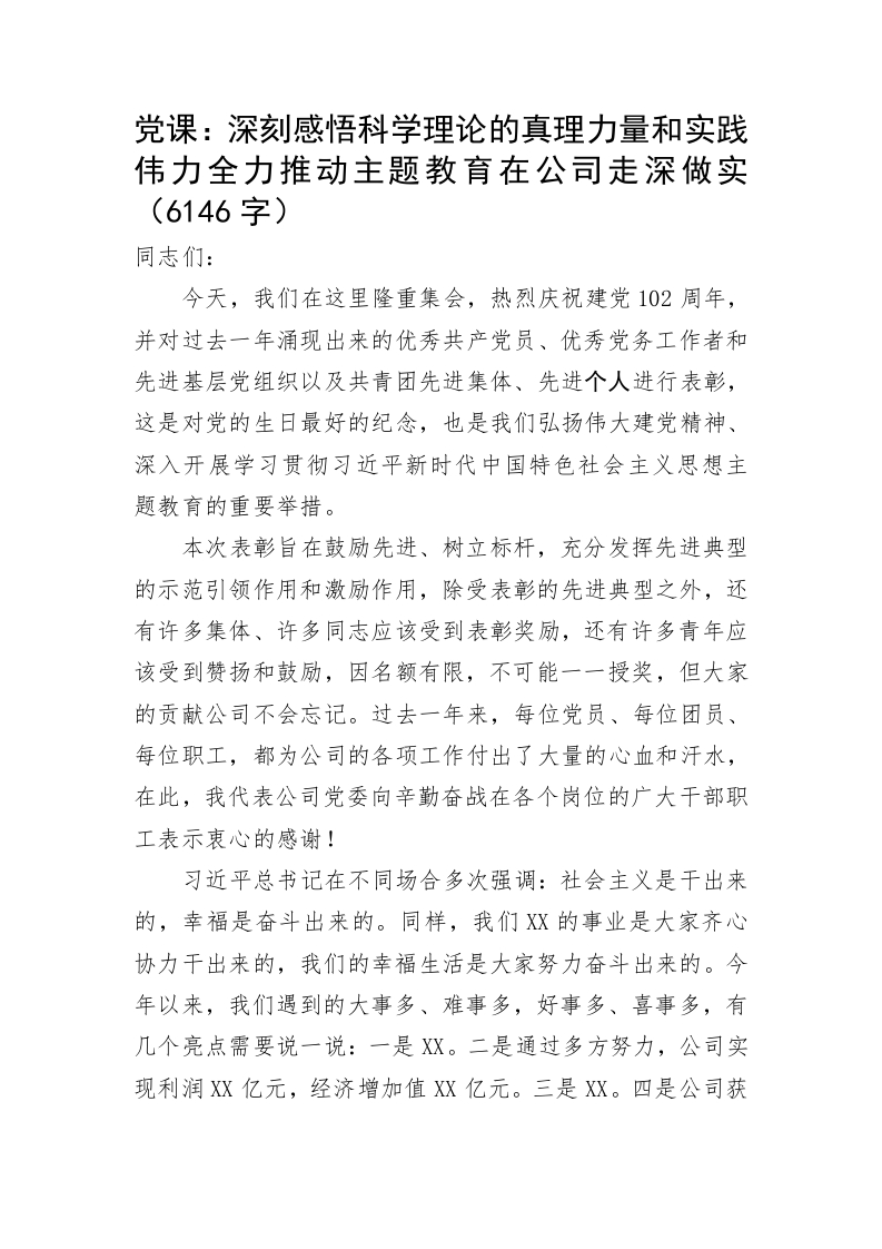 党课:深刻感悟科学理论的真理力量和实践伟力全力推动主题教育在公司走深做实(6146字)同志们:今天,我们在这里隆重集会,热烈庆祝建党102周年,并对过去一年涌现出来的优秀共产党员、优秀党务工作者和先进基层党组织以及共青团先进集体、先进个人进行表彰,这是对党的生日最好的纪念,也是我们弘扬伟大建党精神、深入开展学习贯彻习近平新时代中国特色社会主义思想主题教育的重要举措。本次表彰旨在鼓励先进、树立标杆,充分发挥先进典型的示范引领作用和激励作用,除受表彰的先进典型之外,还有许多集体、许多同志应该受到表彰奖励,还有许多青年应该受到赞扬和鼓励,因名额有限,不可能一一授奖,但大家的贡献公司不会忘记。过去一年来,每位党员、每位团员、每位职工,都为公司的各项工作付出了大量的心血和汗水,在此,我代表公司党委向辛勤奋战在各个岗位的广大干部职工表示衷心的感谢!习近平总书记在不同场合多次强调:社会主义是干出来的,幸福是奋斗出来的。同样,我们XX的事业是大家齐心协力干出来的,我们的幸福生活是大家努力奋斗出来的。今年以来,我们遇到的大事多、难事多,好事多、喜事多,有几个亮点需要说一说:一是X。二是通过多方努力,公司实现利润XX亿元,经济增加值XX亿元。三是XX。四是公司获得了全国XX荣誉。凡是过往,皆为序章。对照全年工作的任务书、路线图和时间表,我们还有很多工作要做,还有很多难关要闯。下半年,面对新的机遇和挑战,我们要凝心聚力、踔厉奋发,以昂扬的斗志、饱满的热情、扎实的作风统筹推进XX和XX等各项工作,在新征程上交出高质量发展优异答卷。由于时间关系,我只展开讲一项下半年的重点工作,那就是深入开展学习贯彻习近平新时代中国特色社会主义思想主题教育。只有开展好主题教育,我们才能方向明、思路清,步子稳、干劲足,才能保持统一的思想、坚定的意志、协调的行动、强大的战斗力,才能圆满完成各项工作任务。开展好主题教育是当前和今后一个时期的重大政治任务,结合近期深入学习和思考,我谈一下心得体会。一、为什么要开展主题教育党的理论创新每前进一步,理论武装就要跟进一步。这次主题教育,是贯彻党的XX大精神的重大举措,也是一件事关全局的大事,习近平总书记用“三个必然要求”深刻阐述开展这次主题教育的重大意义:是统一全党思想意志行动、始终保持党的强大凝聚力、战斗力的必然要求,是推动全党积极担当作为、不断开创事业发展新局面的必然要求,是深入推进全面从严治党、以党的自我革命引领社会革命的必然要求。这次主题教育,对于统一全党思想、解决党内存在的突出问题、始终保持党同人民群众血肉联系、推动党和国家事