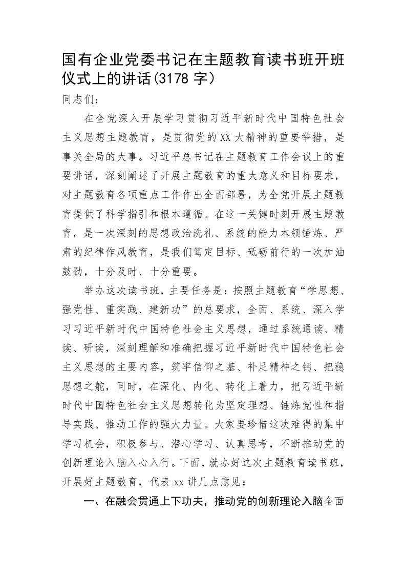 国有企业党委书记在主题教育读书班开班仪式上的讲话(3178字)同志们:在全党深入开展学习贯彻习近平新时代中国特色社会主义思想主题教育,是贯彻党的XX大精神的重要举措,是事关全局的大事。习近平总书记在主题教育工作会议上的重要讲话,深刻阐述了开展主题教育的重大意义和目标要求,对主题教育各项重点工作作出全面部署,为全党开展主题教育提供了科学指引和根本遵循。在这一关键时刻开展主题教育,是一次深刻的思想政治洗礼、系统的能力本领锤炼、严肃的纪律作风教育,是我们笃定目标、砥砺前行的一次加油鼓劲,十分及时、十分重要。举办这次读书班,主要任务是:按照主题教育“学思想、强党性、重实践、建新功”的总要求,全面、系统、深入学习习近平新时代中国特色社会主义思想,通过系统通读、精读、研读,深刻理解和准确把握习近平新时代中国特色社会主义思想的主要内容,筑牢信仰之基、补足精神之钙、把稳思想之舵,同时,在深化、内化、转化上着力,把习近平新时代中国特色社会主义思想转化为坚定理想、锤炼党性和指导实践、推动工作的强大力量。大家要珍惜这次难得的集中学习机会,积极参与、潜心学习、认真思考,不断推动党的创新理论入脑入心入行。下面,就办好这次主题教育读书班,开展好主题教育,代表Xx讲几点意见:一、在融会贯通上下功夫,推动党的创新理论入脑全面学习领会习近平新时代中国特色社会主义思想没有捷径可走、更不能一蹴而就,要坚持读原著学原文悟原理,深刻领悟贯穿其中的马克思主义基本原理,系统掌握习近平新时代中国特色社会主义思想的基本观点、科学体系,从时代背景和历史方位、贯通主题和重大意义、精髓要义和根本原则等方面,深入学习领会这一重要思想的时代意义、理论意义、实践意义,深刻理解蕴含其中的核心要义、精神实质、丰富内涵、实践要求,不断增进对党的创新理论的政治认同、思想认同、理论认同、情感认同,坚定对马克思主义的信仰、对中国特色社会主义的信念、对实现中华民族伟大复兴中国梦的信心。要聚焦重点,抓纲带目,自觉用习近平新时代中国特色社会主义思想改造主观世界,深刻领会这一思想关于坚定理想信念、提升思想境界、加强党性锻炼等一系列要求,始终保持共产党人的政治本色。要把习近平总书记在新时代不同阶段的重要讲话放在一个动态、递进的实践中去理解和深化,把习近平总书记对各方面工作提出的具体要求,放在整个中国特色社会主义理论体系中来认识和把握,融会贯通、透彻理解。要与学习习近平总书记对建设现代流通系统的重要讲话和指示批示精神联系贯通起来,以高度的政治自觉深学笃行,不断强化对党忠诚的政治品格、百折不挠的奋斗精神、创新求变的胆识勇气、舍我其谁的责任担当,在践行服务现代流通、保障国计民生的使命责任中,始终保持中储人应有的初心使命,切实增强“四个意识”、坚定“四个自信”、做到“两个维护”,朝着Xx目标奋勇前进。二、在学深悟透
