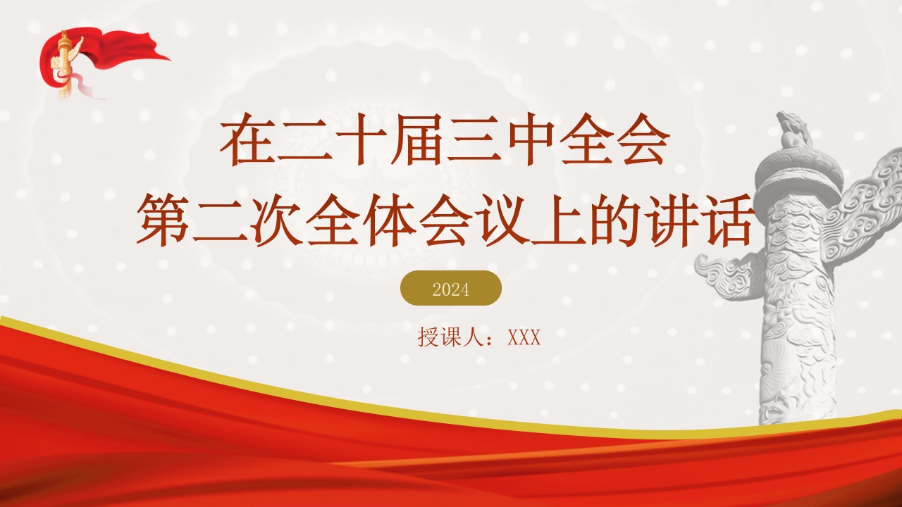 在二十届三中全会第二次全体会议上的讲话2024授课人:XXX前言这次全会,听取了中央政治局工作报告,分析了当前形势和任务,审议通过了《中共中央关于进一步全面深化改革、推进中国式现代化的决定》,圆满完成了各项议程。全会通过的《决定》,总结运用改革开放以来特别是新时代全面深化改革的经验,深入分析了推进中国式现代化面临的新形势新要求,集中全党全社会智慧,科学谋划了围绕中国式现代化进一步全面深化改革的总体部署,是指导新征程上进一步全面深化改革的纲领性文件。学习好贯彻好全会精神是当前和今后一个时期全党全国的一项重大政治任务。
