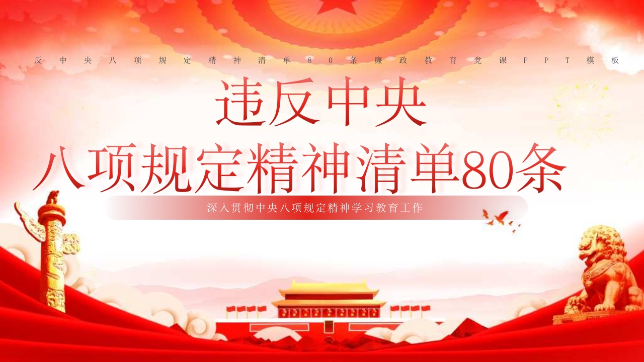 央八项规定精清●单80条廉政教党T模板违反中央八项规定精神清单80条深入贯彻中央八项规定精神学习教育工作目录中央列出违反八项规定清单80条的具体内容如下:01经费管理04公务出差02公务接待05临时出国03会议活动06公务用车改革07停建与清理办公用房