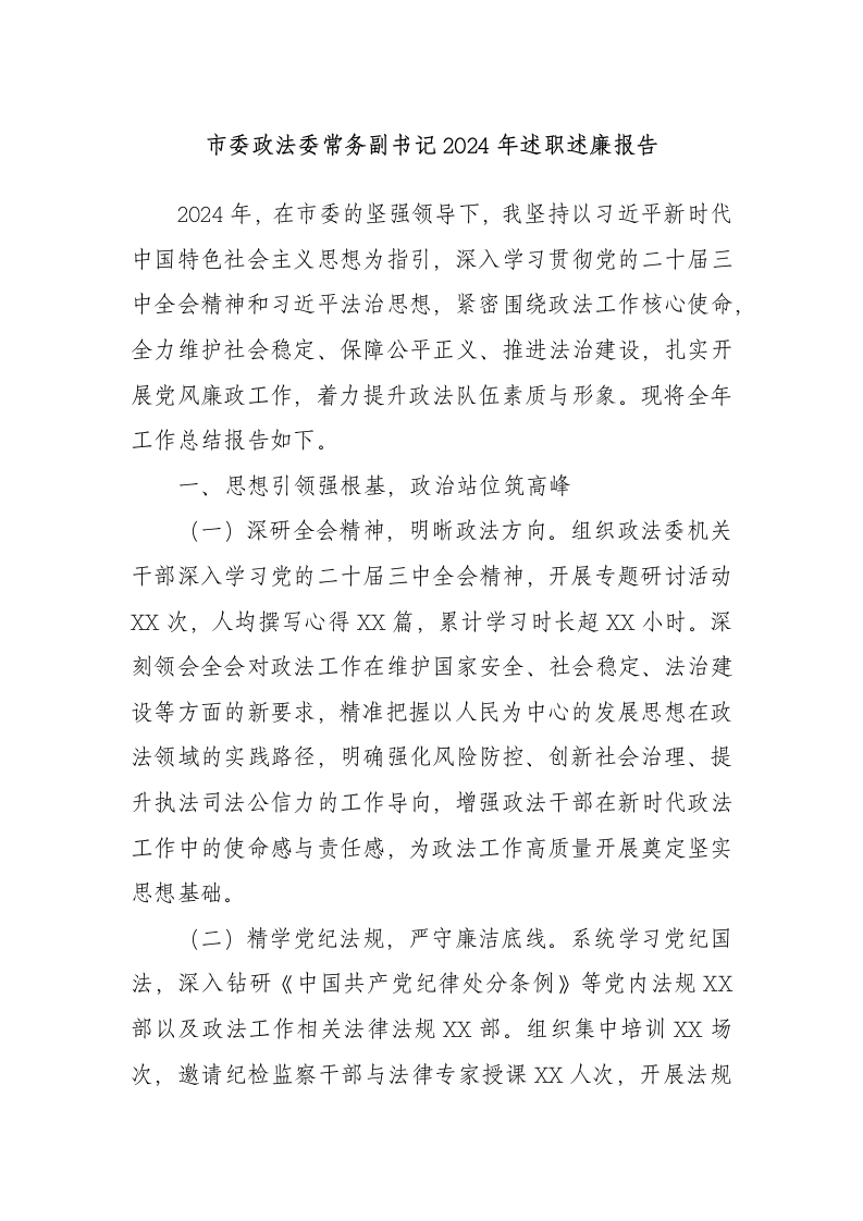 市委政法委常务副书记2024年述职述廉报告2024年,在市委的坚强领导下,我坚持以习近平新时代中国特色社会主义思想为指引,深入学习贯彻党的二十届三中全会精神和习近平法治思想,紧密围绕政法工作核心使命,全力维护社会稳定、保障公平正义、推进法治建设,扎实开展党风廉政工作,着力提升政法队伍素质与形象。现将全年工作总结报告如下。一、思想引领强根基,政治站位筑高峰(一)深研全会精神,明晰政法方向。组织政法委机关干部深入学习党的二十届三中全会精神,开展专题研讨活动X次,人均撰写心得X篇,累计学习时长超X小时。深刻领会全会对政法工作在维护国家安全、社会稳定、法治建设等方面的新要求,精准把握以人民为中心的发展思想在政法领域的实践路径,明确强化风险防控、创新社会治理、提升执法司法公信力的工作导向,增强政法干部在新时代政法工作中的使命感与责任感,为政法工作高质量开展奠定坚实思想基础。(二)精学党纪法规,严守廉洁底线。系统学习党纪国法,深入钻研《中国共产党纪律处分条例》等党内法规XX部以及政法工作相关法律法规X部。组织集中培训X场次,邀请纪检监察干部与法律专家授课XX人次,开展法规知识测试X次,平均成绩达X分以上,合格率为X%。通过学习与考核,使政法干部明晰纪律红线与法律底线,确保政法工作依法依规开展,坚决杜绝违规违纪行为,维护政法队伍的纯洁性与权威性。(三)牢筑意识形态,把控舆论导向。高度重视意识形态工作,召开专题会议研究部署X次,制定意识形态工作责任清单,明确任务X项。加强对政法宣传阵地监管,审核发布政法工作信息X余条,监测舆情信息X条,及时处置敏感舆情X起。组织意识形态专题培训X场,覆盖政法干部X人次,有效提升全员对意识形态工作重要性的认识,在执法司法、矛盾化解等工作中积极传播正能量,维护国家政治安全与社会稳定。二、维稳安保筑防线,社会环境保平安(一)风险防控精施策,隐患排查无死角。建立健全社会稳定风险评估机制,制定评估标准X项,开展重大项目、决策风险评估X次。加强矛盾纠纷排查化解工作,构建市、县、乡、村四级排查网络,排查矛盾纠纷X起,化解率达XX%。强化重点人员管控,建立重点人员信息库,纳入管控XX人,落实管控措施X项,有效防范各类风险隐患,维护社会稳定。(二)安保工作强部署,安全守护全方位。精心组织各类重大活动安保工作,制定安保方案X份,投入安保力量