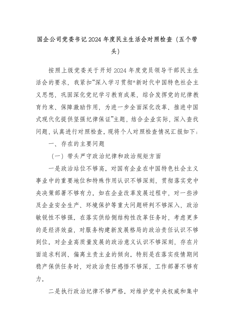 国企公司党委书记2024年度民主生活会对照检查(五个带头)按照上级党委关于开好2024年度党员领导干部民主生活会的要求,我紧扣“深入学习贯彻*新时代中国特色社会主义思想,巩固深化党纪学习教育成果,综合发挥党的纪律教育约束、保障激励作用,为进一步全面深化改革、推进中国式现代化提供坚强纪律保证”主题,结合企业实际,深入查找问题,认真进行对照检查。现将个人对照检查情况汇报如下:一、存在的主要问题(一)带头严守政治纪律和政治规矩方面一是政治站位不够高。对国有企业在中国特色社会主义事业中的重要地位和特殊作用认识不够深刻,贯彻落实党中央决策部署不够有力。如在企业改革发展过程中,对一些涉及企业安全生产、环境保护等重大问题研判不够深入,政治敏锐性不够强。在落实供给侧结构性改革任务时,考虑更多的是经济效益,对服务构建新发展格局的政治责任认识不够到位。对企业高质量发展的政治意义认识不够深刻,存在片面追求利润、偏离主责主业的倾向。特别是在落实疫情期间稳产保供任务时,对政治责任感悟不够深,工作部署不够有力。二是执行政治纪律不够严格。对维护党中央权威和集中统一领导在企业工作中的具体要求把握不够准确,有时存在把政治要求当作一般经营目标的情况。如在贯彻落实上级重大决策部署时,存在打折扣、搞变通的问题。在涉及企业重大决策时,政治考量不够充分,导致一些决策偏离了中央精神。对企业内部政治生态建设重视不够,存在一些破坏政治生态的现象得不到及时纠治。特别是在落实意识形态工作责任制方面,对企业文化、企业价值观的引领作用认识不够深刻,导致企业政治生态不够纯洁。三是防范政治风险意识不够强。对国有企业在维护国家经济安全中的重要作用认识不够深刻,风险意识和底线思维不够。如在企业重大投资决策中,对涉及政治安全、意识形态等方面的风险研判不够充分。在开展国际合作时,对一些敏感领域和关键技术的政治风险评估不够深入。对企业内部的重点领域和关键环节政治风险排查不够细致,存在隐患。特别是在企业改革创新过程中,对一些新情况新问题的政治影响分析不够深入,处置不够及时。(二)带头增强党性、严守纪律、砥砺作风方面一是组织纪律执行不够严格。在企业重大事项决策中,民主集中制执行不够到位。如在“三重一大”事项决策过程中,存在程序不规范、把关不严格的问题。对企业中层以上干部的选拔任用,存在超职数配备、违规使用的现象。在干部调整交流中,执行组织程序不够规范,存在先定调后报批的情