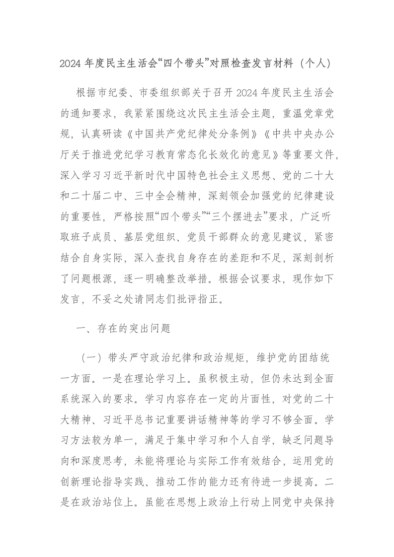 2024年度民主生活会“四个带头”对照检查发言材料(个人)根据市纪委、市委组织部关于召开2024年度民主生活会的通知要求,我紧紧围绕这次民主生活会主题,重温党章党规,认真研读《中国共产党纪律处分条例》《中共中央办公厅关于推进党纪学习教育常态化长效化的意见》等重要文件,深入学习习近平新时代中国特色社会主义思想、党的二十大和二十届二中、三中全会精神,深刻领会加强党的纪律建设的重要性,严格按照“四个带头”“三个摆进去”要求,广泛听取班子成员、基层党组织、党员干部群众的意见建议,紧密结合自身实际,深入查找自身存在的差距和不足,深刻剖析了问题根源,逐一明确整改举措。根据会议要求,现作如下发言,不妥之处请同志们批评指正。一、存在的突出问题(一)带头严守政治纪律和政治规矩,维护党的团结统一方面。一是在理论学习上。虽积极主动,但仍未达到全面系统深入的要求。学习内容存在一定的片面性,对党的二十大精神、习近平总书记重要讲话精神等的学习不够全面。学习方法较为单一,满足于集中学习和个人自学,缺乏问题导向和深度思考,未能将理论与实际工作有效结合,运用党的创新理论指导实践、推动工作的能力还有待进一步提高。二是在政治站位上。虽能在思想上政治上行动上同党中央保持高度一致,但有时站位不够高远。思考问题时多局限于自身分管领域,对中央和省委、市委的决策部署缺乏从政治和全局高度的深入理解,未能充分认识到其作为政治任务的重要性,运用“两个确立”指导工作的能力还有待加强。三是在政治敏锐性方面。对新形势下维护党的形象权威、宣传党的政策主张、巩固党的执政基础等问题研究不够深入,对意识形态领域的复杂性缺乏足够的警惕和鉴别力。面对社会上的个别消极议论或负面言论,抵制力度不够,未充分发挥党员领导干部应有的作用。(二)带头增强党性、严守纪律、砥砺作风方面。一是宗旨意识有所淡化。在处理对上负责和对下负责的关系上不够协调,对群众利益和诉求的重视程度不足。在工作中未能充分换位思考,将群众利益放在首位,对一些涉及群众利益的工作重视不够,落实不到位。二是管党治党责任落实不够到位。对“两个责任”的重视程度和压力传导均不足,在日常工作中对廉洁方面的监督管理较为宽松。存在“老好人”思想,对一些苗头性、倾向性问题未能及时提醒和纠正。三是工作作风不够扎实。存在重安排部署、轻督查落实的问题。习惯于将工作交给分管同志后便不再过问,未能做到重大任务亲自部署、关键环节亲自把关、落实情况亲自督查,导致工作落实效果有时不尽如人意。