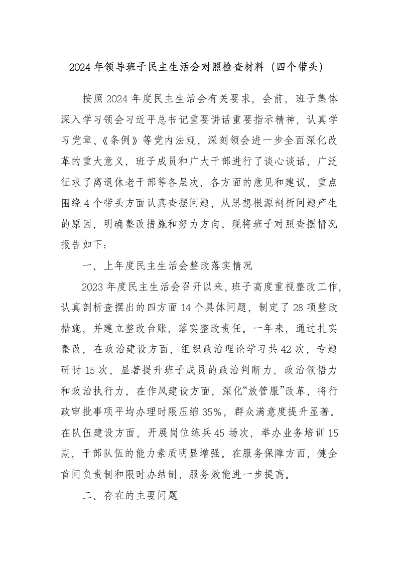 2024年领导班子民主生活会对照检查材料(四个带头)按照2024年度民主生活会有关要求,会前,班子集体深入学习领会习近平总书记重要讲话重要指示精神,认真学习党章、《条例》等党内法规,深刻领会进一步全面深化改革的重大意义,班子成员和广大干部进行了谈心谈话,广泛征求了离退休老干部等各层次、各方面的意见和建议,重点围绕4个带头方面认真查摆问题,从思想根源剖析问题产生的原因,明确整改措施和努力方向。现将班子对照查摆情况报告如下:一、上年度民主生活会整改落实情况2023年度民主生活会召开以来,班子高度重视整改工作,认真剖析查摆出的四方面14个具体问题,制定了28项整改措施,并建立整改台账,落实整改责任。一年来,通过扎实整改,在政治建设方面,组织政治理论学习共42次,专题研讨15次,显著提升班子成员的政治判断力、政治领悟力和政治执行力。在作风建设方面,深化“放管服”改革,将行政审批事项平均办理时限压缩35%,群众满意度提升显著。在队伍建设方面,开展岗位练兵45场次,举办业务培训15期,干部队伍的能力素质明显增强。在服务保障方面,健全首问负责制和限时办结制,服务效能进一步提高。二、存在的主要问题(一)带头严守政治纪律和政治规矩方面一是理论学习不够透彻。对于习近平新时代中国特色社会主义思想的学习贯彻不够系统深入,仍存在学用结合不紧密的现象。比如,在理论学习中心组的学习过程中,学习计划执行力欠缺、形式较为单一、缺乏深入研讨交流等问题依然存在。对党的二十届三中全会精神的学习仍停留在较为表面的层次,对全面深化改革的重要论述缺乏深刻理解,未能结合部门具体实际谋划出明确的工作思路。在落实意识形态工作责任制方面,存在重视程度不够、研判深度不足、措施执行不到位的问题。二是政治敏锐性不强。对一些苗头性和倾向性问题的敏锐度不高,缺乏及时的分析判断。比如,对于本系统本领域出现的负面舆情关注不够,研判和处置不够快速。在贯彻落实上级重大决策部署过程中,政治风险的预见性不强,工作预案不够周密完善。在处理部分热点敏感问题时,采取措施不当,导致产生了不良影响。三是政治执行力偏差。对上级决策部署的贯彻还存在“温差”工作推进不够扎实有效。比如,在推进XX政策的过程中,面临政策宣传不充分、措施细化力度不足、督导检查不够及时的问题。在一些重点工作任务的推进中,存在重部署而轻落实的现象,导致工作进展缓慢和完成质量不高。尤其在涉及民生的一些重点项目中,推动力度不够有力,影响了群众的获得感和满意度。