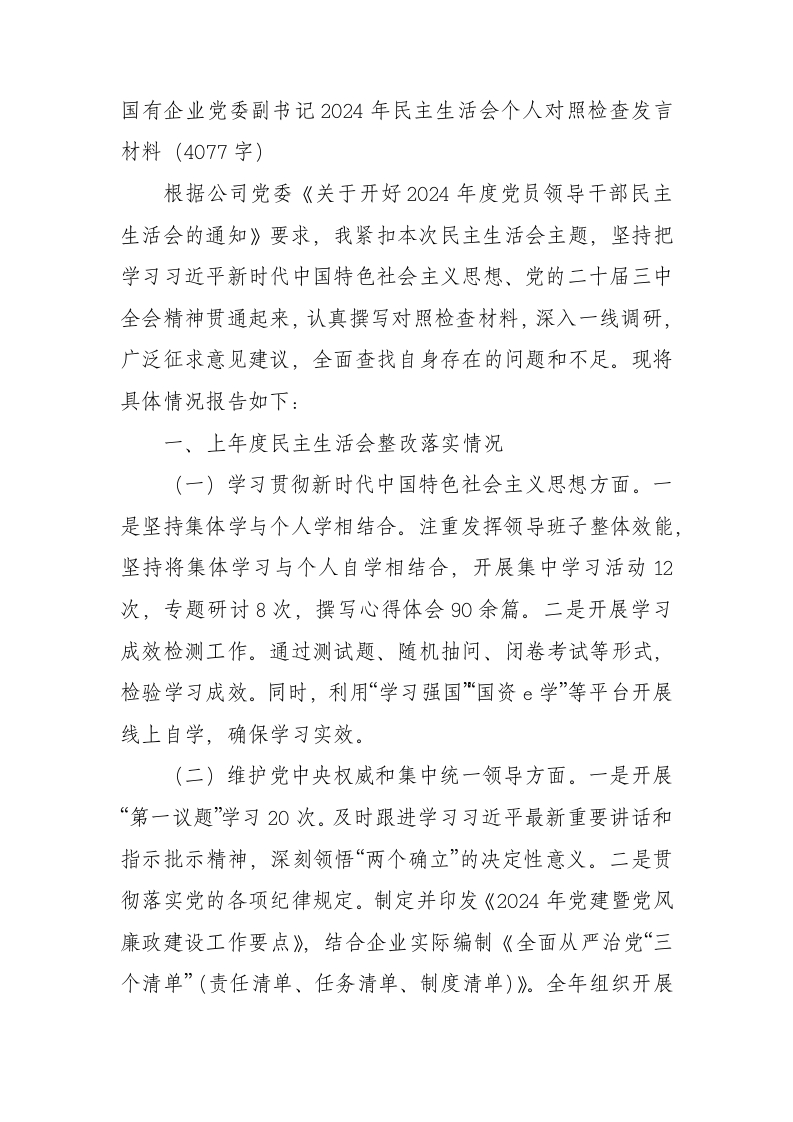 国有企业党委副书记2024年民主生活会个人对照检查发言材料(4077字)根据公司党委《关于开好2024年度党员领导干部民主生活会的通知》要求,我紧扣本次民主生活会主题,坚持把学习习近平新时代中国特色社会主义思想、党的二十届三中全会精神贯通起来,认真撰写对照检查材料,深入一线调研,广泛征求意见建议,全面查找自身存在的问题和不足。现将具体情况报告如下:一、上年度民主生活会整改落实情况(一)学习贯彻新时代中国特色社会主义思想方面。一是坚持集体学与个人学相结合。注重发挥领导班子整体效能,坚持将集体学习与个人自学相结合,开展集中学习活动12次,专题研讨8次,撰写心得体会90余篇。二是开展学习成效检测工作。通过测试题、随机抽问、闭卷考试等形式,检验学习成效。同时,利用“学习强国“国资é学”等平台开展线上自学,确保学习实效。(二)维护党中央权威和集中统一领导方面。一是开展“第一议题”学习20次。及时跟进学习习近平最新重要讲话和指示批示精神,深刻领悟“两个确立”的决定性意义。二是贯彻落实党的各项纪律规定。制定并印发《2024年党建暨党风廉政建设工作要点》,结合企业实际编制《全面从严治党“三个清单”(责任清单、任务清单、制度清单)》。全年组织开展党风廉政建设专题会议3次,召开党风廉政建设和反腐败工作研判会议2次,专题研究部署党建工作及党风廉政建设工作重点事项。(三)践行宗旨、服务人民方面。一是围绕党的二十届三中全会精神组织生产一线调研6次,走访职工150余人次,发放调查问卷150份。二是开展职工思想动态调研4次,建立项目“党员责任区“党员示范岗”6个。积极开展“我为群众办实事”活动,组织“金樽有约”职工座谈会7次,征集意见建议12条。三是精准对接职工需求,推动民生工程建设取得实效。推进“幸福驿站建设工作,先后在4个区域建成4个“幸福驿站”把温暖送到职工心坎上;开展爱心帮扶送清凉、“金秋助学”等活动,慰问困难职工140余人次,投入帮扶资金12万余元。(四)求真务实、狠抓落实方面。优化生产流程,通过工艺改良和设备调整等措施降低生产成本360万元。减少资源浪费,制定《固废渣土管理规定》,严控固废渣土排放,降低外购石粉量15%。(五)以身作则、廉洁自律方面。一是严格遵守廉洁自律准则,主动接受党组织和群众监督,坚决反对特权思想、特权现象,切实做到自身正、身边清。二是深入基层调研40余次,收集解决职工群众急难愁盼问题6个。三是严格执行中央八项规定精神及集团、公司有关廉洁从业规定。如实报