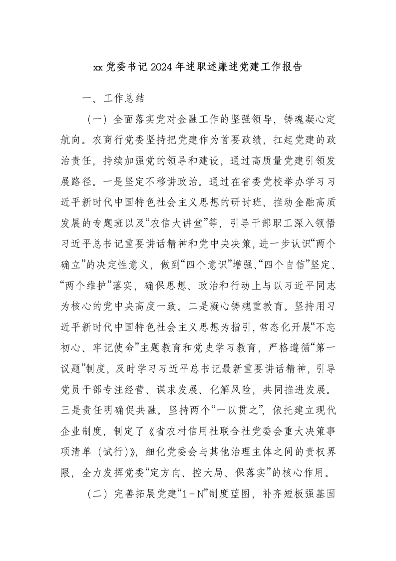 xx党委书记2024年述职述廉述党建工作报告一、工作总结(一)全面落实党对金融工作的坚强领导,铸魂凝心定航向。农商行党委坚持把党建作为首要政绩,扛起党建的政治责任,持续加强党的领导和建设,通过高质量党建引领发展路径。一是坚定不移讲政治。通过在省委党校举办学习习近平新时代中国特色社会主义思想的研讨班、推动金融高质发展的专题班以及“农信大讲堂”等,引导干部职工深入领悟习近平总书记重要讲话精神和党中央决策,进一步认识“两个确立”的决定性意义,做到“四个意识”增强、“四个自信”坚定、“两个维护”落实,确保思想、政治和行动上与以习近平同志为核心的党中央高度一致。二是凝心铸魂重教育。坚持用习近平新时代中国特色社会主义思想为指引,常态化开展“不忘初心、牢记使命”主题教育和党史学习教育,严格遵循“第一议题”制度,及时学习习近平总书记最新重要讲话精神,引导党员干部专注经营、谋求发展、化解风险,共同推进发展。三是责任明确促共融。坚持两个“一以贯之”,依托建立现代企业制度,制定了《省农村信用社联合社党委会重大决策事项清单(试行)》,细化党委会与其他治理主体之间的责权界限,全力发挥党委“定方向、控大局、保落实”的核心作用。(二)完善拓展党建“1+N”制度蓝图,补齐短板强基固本。围绕习近平总书记关于增强依规治党自觉性、把牢政治方向、担起政治责任的重要指示精神,严格立规、细化制度、强化执行,让规章制度彰显威严,为农商行党建提供坚实的制度保障。一是创新建设,推动制度由点到面。以《中共省农村信用社联合社委员会关于加强新形势下党的建设工作的实施意见》为纲,建立涵盖党的政治、思想、组织、作风、纪律等30项制度,构建系统完整、贯穿互补的党建“1+N”制度框架,为形成“大党建”协调推进提供了坚实支撑。二是动态延展,实现制度由有限到完备。坚持“动态延展、不断完善”在原有31项党建制度基础上,根据党中央和省委最新部署,增设《关于进一步推动基层行社党委履行全面从严治党责任的意见》等28项制度文件,将全面推进党建“五位一体”建设落到实处。三是经常学习,保证制度知行合一。已将党建“1+N”制度汇编发至15个党组织,线上线下互动推进,以“农信大讲堂”和“送教下行”为载体,结合“e学堂”平台,通过“每周一练随堂测试”等方式,强化制度学习和执行,定期进行制度落实效果的自查互查,力求实现学以致用、知行合一。(三)全面提升党支部建设质量,强化先锋引领助发展。坚定树立“党的一切工作到支部”的指导思想,致力于将各党支部打造成教育党员、联系群众、推动改革的坚固堡垒。一是夯实支部建设,实现“应建尽建“应新尽新”着力增强基层