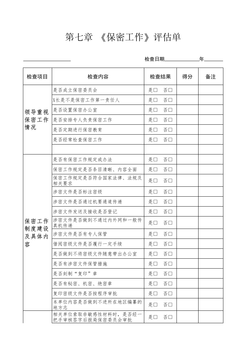 第七章《保密工作》评估单检查日期年检查项目检查内容检查结果得分备注是否成立保密委员会是口否口X长是不是保密工作第一责任人领导重视是否设置保密办公室保密工作是否安排专人负责保密工作是口否口情况是否定期进行保密教育是口否口是否经常检查保密工作是口否口是否有保密工作规定或办法是口否口保密工作规定是否条目清晰、内容全面保密工作规定是否符合国家法律、法规及相关要求是口否口涉密文件是否标注密级是口否口涉密文件是否通过机要通道传递涉密文件发送及接收是否登记是口否口保密工作涉密文件是否做到不通过内外网和一般传真机传递是口否口制度建设及具体内涉密文件是否有专人保管是口否口容借阅密级文件是否履行一定手续是口否口是否做到不将密级文件随意带出办公室是否有涉密文件保管措施是否刻制“复印”章是否有秘密、机密、绝密章是口否口复印密级文件是否按程序审批本单位内容是否做到不进所在地区编纂的地方志是口否口相关单位索取非敏感性材料时,是否经一把手审核签字后报局保密委员会审批是口否口保密传真机是否有专人负责是口否口密码机是否有专柜存放是口否口保密工作办公用计算机是否做到不与外网连接是口否口制度建设内网是否与外网完全分离是口否口及具体内容外网计算机是否不涉及本单位敏感内容是口否口发现失密或泄密现象是否及时向局保密委是口否口员会报告印章是否存放在保险柜里是口否口档案库房是否符合铁窗、铁门、铁柜要求是口否口密级文件是否有专用文件夹和保险柜存放是口否口放置保密传真机的房间是否符合铁窗、铁门、铁柜、报警器的要求是口否口保密传真机是否做到专机专用否口保密工作保密传真机密钥存放是否安全是口否口设施情况传递公文的计算机是否做到专机专用是口否口数码复印机是否有专人负责管理是口否口数码复印机是否单机使用是口否口数码复印机维修前是否拆除硬盘并由专人妥善保管数码复印机报废的硬盘是否按照涉密载体管理的有关规定进行销毁是口否口