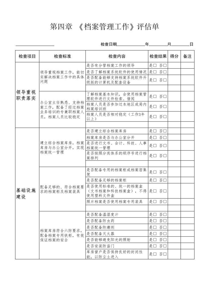 第四章《档案管理工作》评估单检查日期月日检查项目检查标准检查内容检查结果得分备注是否有分管档案工作的领导是口否口领导重视档案工作,能切是否了解档案系统软件的使用情况是口否口实解决档案工作中的具体是否配备能够支持档案系统软件升问题级版的计算机及配套设备领导重视了解档案基本知识,会使用档案管职责落实理软件进行文件检索、借阅是口否口办公室主任熟悉、支持档档案人员是否参加过本地区或局内案工作,配备了经过档案档案培训班业务培训的专兼职档案人员,档案人员比较稳定档案人员是否相对稳定(工作3年以上)是口否口是否建立综合档案库房是口否口档案库房是否与办公室分开是口否口建立综合档案库房,档案是否进行文书、会计、科技、人事库房与办公室分开,实现档案统一管理是口否口档案统一管理是否按照分类体系的顺序号进行档案排列是口否口是否配备专用的档案柜或档案密集架是口否口是否配备足够的档案柜是口否口配备足够的、符合档案要是否使用标准的、统一的档案盒基础设施求的档案柜及档案装具(文书档案和科技档案盒),不得是口否口建设使用塑料文件盒照片档案是否使用档案专用装具是否配备温湿度汁是口否口是否配备防虫药是否配备防潮剂档案库房符合六防要求,配备档案专用铁柜,有效是否配备灭火器是口否口保证档案的安全是否能够避免阳光的照射是口否口是否安装防盗门是口否口库房窗户是否保持良好的封闭性是口否口能,以防尘土进入