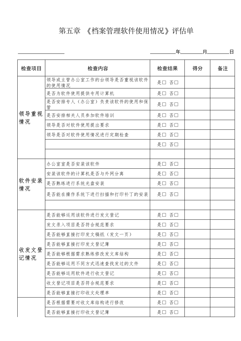 第五章《档案管理软件使用情况》评估单年日检查项目检查内容检查结果得分备注领导或主管办公室工作的台领导是否重视该软件的使用情况是否为软件使用提供专用计算机是否安排专人(办公室)负责该软件的使用和保管是口否口领导重视是否安排相关人员参加软件培训是口否口情况领导是否对软件使用提出要求是口否口领导是否对软件使用情况进行定期检查是口否口办公室室是否安装该软件是口否口安装该软件的计算机是否与外网分离是口否口软件安装是否熟练进行系统光盘安装是口否口情况是否能在操作系统下进行扫描和打印补丁的安装是口否口是否能够运用该软件进行发文登记是口否口发文录入项目是否符合规范要求是口否口是否能够直接打印发文稿纸(发文一页)是口否口是否能够直接打印发文登记簿是口否口收发文登是否能够根据需求熟练修改发文库结构记情况是否能够运用不同方式迅速查找发过的文件是口否口是否能够运用软件进行收文登记是口否口收文登记项目是否符合规范要求是口否口是否能够直接打印收文处理单是否根据需要对收文库结构进行修改是口否口是否能够直接打印收文登记簿是口否口是否能同时一次性打印几份收文处理单收发文登记情况是否能够运用不同方式迅速检索收过的文件是口否口收文处理单、收文登记簿是否符合规范要求是口否口是否能够对收、发文数据进行导入、导出是口否口是否将基本情况、领导讲话、批示、制度等建立常备资料库(抽查)是口否口常备资料是否挂电子文档库建设情是否经常对常备资料库进行维护是口否口况是否经常利用常备资料库中的资料(抽查)是口否口是否熟练进行档案库的建立是口否口是否能够根据需求熟练修改档案报表是口否口是否能够熟练进行档案数据的导入、导出是口否口是否根据收发文数据实现档案自动立卷是口否口档案自动立卷的对应关系是否准确是口否口是否由档案库生成档案卷内目录、案卷目录、案卷封面、案卷脊背是口否口文书档案是否实现目录级管理是口否口档案办公科技档案是否实现目录级管理是口否口自动化库存全部文书档案是否实现目录级管理是口否口库存全部文书档案(永久保管)是否实现文件级管理是口否口是否经常进行数据库的整体备份是口否口是否实现数码照片的整体挂接是否建立照片档案库是口否口是否熟练应用智能查询、分类查询、综合查询、跨类检索进行文件档案查询文书档案是否开始挂接电子文档是口否口