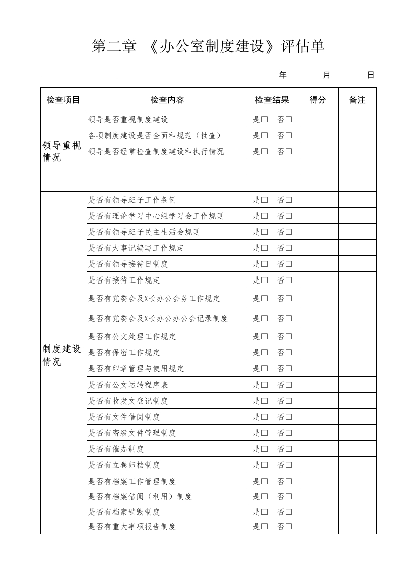 第二章《办公室制度建设》评估单年月日检查项目检查内容检查结果得分备注领导是否重视制度建设是口否口各项制度建设是否全面和规范(抽查)领导重视情况领导是否经常检查制度建设和执行情况是否有领导班子工作条例是口否口是否有理论学习中心组学习会工作规则是口否口是否有领导班子民主生活会规则是口否口是否有大事记编写工作规定是否有领导接待日制度是口否口是否有接待工作规定是否有党委会及X长办公会务工作规定是口否口是否有党委会及X长办公办公会记录制度是否有公文处理工作规定是口否口制度建设是否有保密工作规定是口否口情况是否有印章管理与使用规定是口否口是否有公文运转程序表是否有收发文登记制度是口否口是否有文件借阅制度是口否口是否有密级文件管理制度是否有催办制度是口否口是否有立卷归档制度是口否口是否有档案工作管理制度是否有档案借阅(利用)制度是口否口是否有档案销毁制度是口否口是否有重大事项报告制度是口否口是否有重大节日慰问制度是口否口是否有干部休假制度是口否口制度建设情况是否有信息报送制度是否有通讯员管理制度各项制度是否符合国家法律、法规及上级有关规定(抽查)是口否口各项制度是否条目清晰、可操作性强(抽查)是口否口各项制度是否经常修订和不断调整、完善(抽查)是口否口制度落实各项制度是否形成书面文字以便备查情况是否严格按制度办事(抽查)抓制度落实是否有得力措施(抽查)是口否口