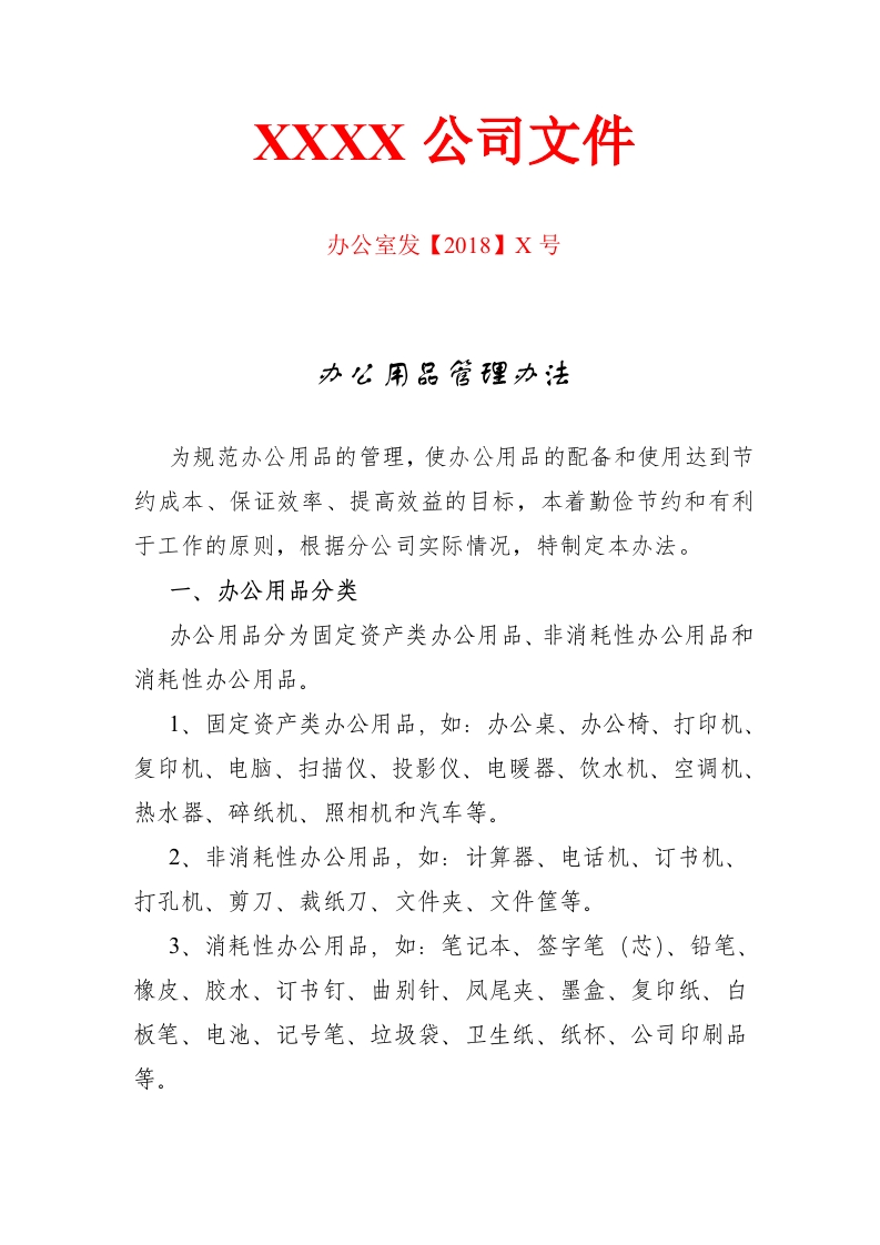 XXXX公司文件办公室发【2018】X号为规范办公用品的管理,使办公用品的配备和使用达到节约成本、保证效率、提高效益的目标,本着勤俭节约和有利于工作的原则,根据分公司实际情况,特制定本办法。一、办公用品分类办公用品分为固定资产类办公用品、非消耗性办公用品和消耗性办公用品。1、固定资产类办公用品,如:办公桌、办公椅、打印机、复印机、电脑、扫描仪、投影仪、电暖器、饮水机、空调机、热水器、碎纸机、照相机和汽车等。2、非消耗性办公用品,如:计算器、电话机、订书机、打孔机、剪刀、裁纸刀、文件夹、文件筐等。3、消耗性办公用品,如:笔记本、签字笔(芯)、铅笔、橡皮、胶水、订书钉、曲别针、凤尾夹、墨盒、复印纸、白板笔、电池、记号笔、垃圾袋、卫生纸、纸杯、公司印刷品等。二、办公用品的申购各部门基于工作需求如需采购办公用品,须首先提交办公用品采购申请(包括品名、规格/型号和数量等),经过经理同意后,由办公室负责人员统一购买。三、办公用品入库1、办公室采购人员负责办公用品入库前的验收,并负责办公用品的登记入库。2、对有质量问题或不符合要求的,由采购人员负责办理调换或退货手续。四、办公用品发放1、各项目部或员工领取办公用品须需要在《办公用品领用簿》上记录、签字。2、限量领取的办公用品主要为消耗性办公用品,签字笔、圆珠笔每人每年限领十支,笔芯每人每季度限领十支,仿皮商务记事本每人每年限领一本,软抄本每人每半年限领一本。3、办公用品的领取须以项目为单位,由项目申领负责人在一定的时间进行品名和数量统计,之后进行申领,如遇特殊情况需个人单独申领的,须经分公司经理同意。