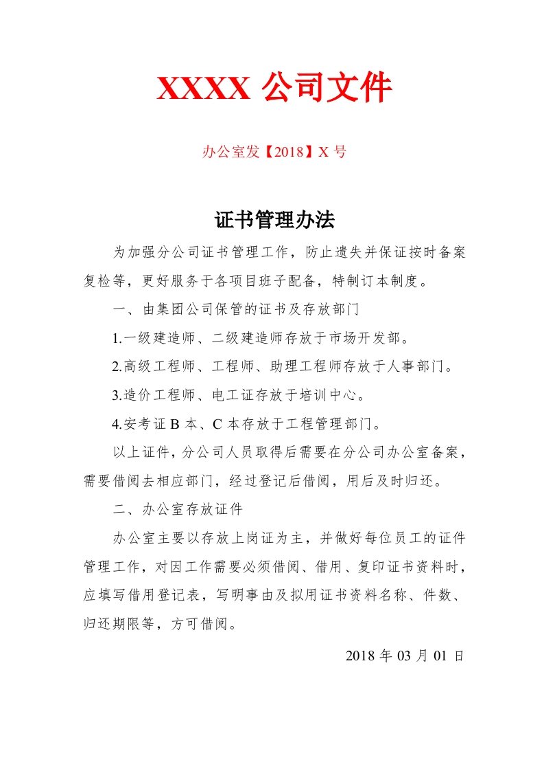 XXXX公司文件办公室发【2018】X号证书管理办法为加强分公司证书管理工作,防止遗失并保证按时备案复检等,更好服务于各项目班子配备,特制订本制度。一、由集团公司保管的证书及存放部门1.一级建造师、二级建造师存放于市场开发部。2.高级工程师、工程师、助理工程师存放于人事部门。3.造价工程师、电工证存放于培训中心。4.安考证B本、C本存放于工程管理部门。以上证件,分公司人员取得后需要在分公司办公室备案,需要借阅去相应部门,经过登记后借阅,用后及时归还。二、办公室存放证件办公室主要以存放上岗证为主,并做好每位员工的证件管理工作,对因工作需要必须借阅、借用、复印证书资料时,应填写借用登记表,写明事由及拟用证书资料名称、件数、归还期限等,方可借阅。2018年03月01日