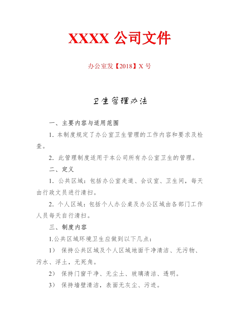 XXXX公司文件办公室发【2018】X号一、主要内容与适用范围1.本制度规定了办公室卫生管理的工作内容和要求及检查。2.此管理制度适用于本公司所有办公室卫生的管理。二、定义1.公共区域:包括办公室走道、会议室、卫生间,每天由行政文员进行清扫。2.个人区域:包括个人办公桌及办公区域由各部门工作人员每天自行清扫。三、制度内容1.公共区域环境卫生应做到以下几点:1)保持公共区域及个人区域地面干净清洁、无污物、污水、浮土,无死角。2)保持门窗干净、无尘土、玻璃清洁、透明。3)保持墙壁清洁,表面无灰尘、污迹。4)保持挂件、画框及其他装饰品表面干净整洁。5)保持卫生间、洗手池内无污垢,经常保持清洁,毛巾放在固定(或隐蔽)的地方。6)保持卫生工具用后及时清洁整理,保持清洁、摆放整齐。7)垃圾篓摆放紧靠卫生间并及时清理,无溢满现象。2.办公用品的卫生管理应做到以下几点:1)办公桌面:办公桌面只能摆放必需物品,其它物品应放在个人抽屉,暂不需要的物品就摆回柜子里,不用的物品要及时清理掉。2)办公文件、票据:办公文件、票据等应分类放进文件夹、文件盒中,并整齐的摆放至办公桌左上角上。3)办公小用品如笔、尺、橡皮檫、订书机、启丁器等,应放在办公桌一侧,要从哪取使用完后放到原位。4)电脑:电脑键盘要保持干净,下班或是离开公司前电脑要关机。5)饮食水机、灯具、打印机、传真机、文具柜等摆放要整齐,保持表面无污垢,无灰尘,蜘蛛网等,办公室内电器线走向要美观,规范,并用护钉固定不可乱搭接临时线。3.个人卫生应注意以下几点:1)不随地吐痰,不随地乱扔垃圾。2)下班后要整理办公桌上的用品,放罢整齐。3)禁止在办公区域抽烟。