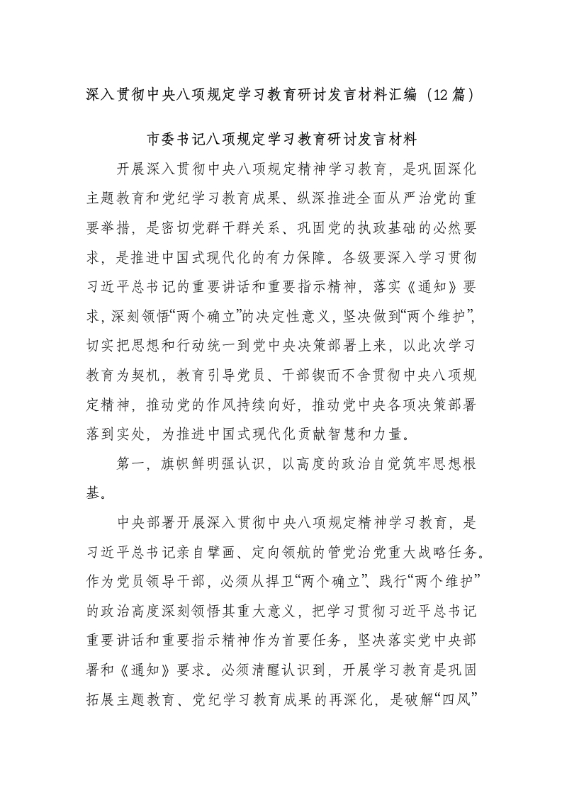 深入贯彻中央八项规定学习教育研讨发言材料汇编(12篇)市委书记八项规定学习教育研讨发言材料开展深入贯彻中央八项规定精神学习教育,是巩固深化主题教育和党纪学习教育成果、纵深推进全面从严治党的重要举措,是密切党群干群关系、巩固党的执政基础的必然要求,是推进中国式现代化的有力保障。各级要深入学习贯彻习近平总书记的重要讲话和重要指示精神,落实《通知》要求,深刻领悟“两个确立”的决定性意义,坚决做到“两个维护”切实把思想和行动统一到党中央决策部署上来,以此次学习教育为契机,教育引导党员、干部锲而不舍贯彻中央八项规定精神,推动党的作风持续向好,推动党中央各项决策部署落到实处,为推进中国式现代化贡献智慧和力量。第一,旗帜鲜明强认识,以高度的政治自觉筑牢思想根基。中央部署开展深入贯彻中央八项规定精神学习教育,是习近平总书记亲自擘画、定向领航的管党治党重大战略任务。作为党员领导干部,必须从捍卫“两个确立”践行“两个维护”的政治高度深刻领悟其重大意义,把学习贯彻习近平总书记重要讲话和重要指示精神作为首要任务,坚决落实党中央部署和《通知》要求。必须清醒认识到,开展学习教育是巩固拓展主题教育、党纪学习教育成果的再深化,是破解“四风”顽疾、夯实党的执政根基的再动员,更是服务中国式现代化建设大局的再赋能。我们要始终以习近平总书记关于作风建设的重要论述为总遵循,保持“永远在路上”的政治清醒,把思想和行动统一到党中央关于全面从严治党的新要求上来。第二,对标对表抓关键,以系统科学的方法推动学查改贯通。开展好中央八项规定精神学习教育,既要抓思想引领凝聚共识,又要抓问题整改赢得民心,更要抓制度完善巩固长效,真正让学习教育的成果转化为推动全面从严治党向纵深发展的实效。一是以“学”筑基。要把习近平总书记关于作风建设的重要论述作为“必学篇目”用好党委理论学习中心组集中研讨、专题读书班领学带学、青年党员“作风微课堂”等载体,逐字研读中央八项规定及其实施细则原文,掌握精神实质、明晰纪律边界。注重以历史视角总结规律,系统梳理党的十八大以来我市在作风建设中形成的“基层减负十二条交叉巡察破解熟人监督难”等有效经验,深度剖析近年查处的“超标准接待“调研走秀场”等典型案例,通过正反对比教育,引导党员干部从实践逻辑中深刻理解“铁规矩“高压线”的刚性。二是以“查”破题。重点聚焦“旧病复发”和“隐形变异”两类突出问题。一方面,强化市、区两级领导班子示范带动,围绕公务接待“一函三单”执行、因公差旅经费核销、考核检查“过度留痕”