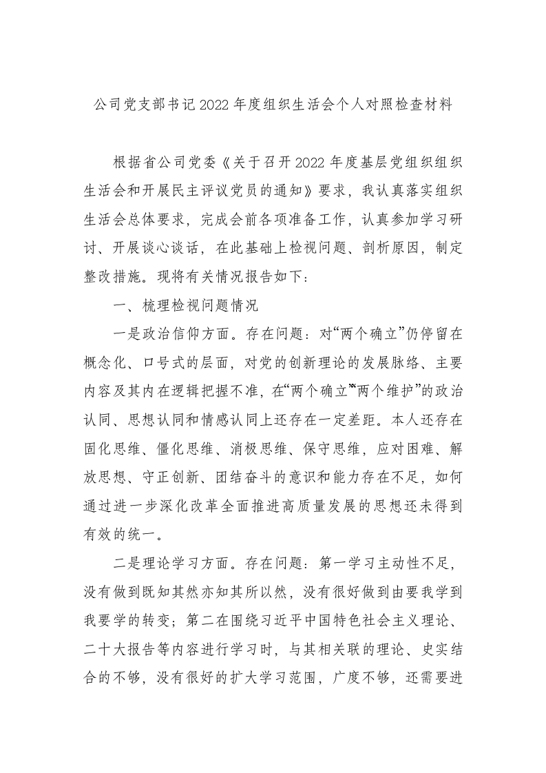 公司党支部书记2022年度组织生活会个人对照检查材料根据省公司党委《关于召开2022年度基层党组织组织生活会和开展民主评议党员的通知》要求,我认真落实组织生活会总体要求,完成会前各项准备工作,认真参加学习研讨、开展谈心谈话,在此基础上检视问题、剖析原因,制定整改措施。现将有关情况报告如下:一、梳理检视问题情况一是政治信仰方面。存在问题:对“两个确立”仍停留在概念化、口号式的层面,对党的创新理论的发展脉络、主要内容及其内在逻辑把握不准,在“两个确立两个维护”的政治认同、思想认同和情感认同上还存在一定差距。本人还存在固化思维、僵化思维、消极思维、保守思维,应对困难、解放思想、守正创新、团结奋斗的意识和能力存在不足,如何通过进一步深化改革全面推进高质量发展的思想还未得到有效的统一。二是理论学习方面。存在问题:第一学习主动性不足,没有做到既知其然亦知其所以然,没有很好做到由要我学到我要学的转变;第二在围绕习近平中国特色社会主义理论、二十大报告等内容进行学习时,与其相关联的理论、史实结合的不够,没有很好的扩大学习范围,广度不够,还需要进一步丰富;第三在学深悟透新时代党的创新理论方面做的还有不到位的情况,对“两个确立”蕴含的历史逻辑、理论逻辑、实践逻辑等方面理解不够通透,思考和站位还不够,没有真正找准贯彻落实的切入点和落脚点。第四在学习成效方面存在不够全面、不够深入、不够细致、不够准确的问题。站在X通信行业全局工作看,X分公司员工素质和客户服务满意度有待进一步提高,与二十大报告提出的网络强国要求有一定差距。三是党员意识方面。存在问题:大局意识不强,思路不够开阔,目光短浅,自觉融入党和国家工作大局意识还不够。对集团要求和战略内涵把握不足。在改革发展方面,对高质量可持续发展的内涵理解不透彻,在加快推进“两个转变”和实现“XXXXX”工作目标上思路还不够清晰。四是能力本领方面。存在问题:对上级的安排部署的重大任务,有时靠“分解任务”方式稀释责任。X业务存在依赖协同环境与政策的情况,将服务向市场价值转换能力欠缺,市场增量的贡献还需提升;X业务资源不足、体系不健全、管理不到位的问题依然突出,依然是制约高质量发展的主要矛盾;社会工程市场拓展局面还未全面打开,只局限于教育、医疗、政府等几个有限行业,与要求的可持续、高质量发展存在一定差距,X市场收入未对分公司整体收入起到良好的支撑作用。
