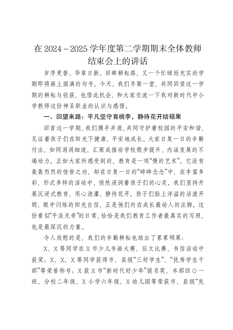 在2024-2025学年度第二学期期末全体教师结束会上的讲话