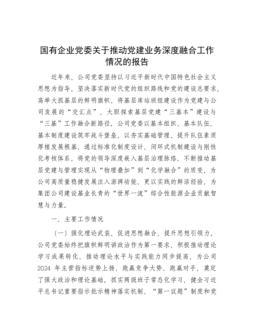国有企业X委关于推动X建业务深度融合工作情况的报告