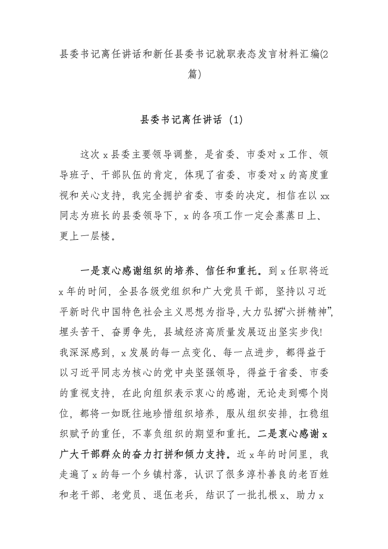 县委书记离任讲话和新任县委书记就职表态发言材料汇编(2篇)县委书记离任讲话((1)这次x县委主要领导调整,是省委、市委对x工作、领导班子、干部队伍的肯定,体现了省委、市委对x的高度重视和关心支持,我完全拥护省委、市委的决定。相信在以x同志为班长的县委领导下,x的各项工作一定会蒸蒸日上、更上一层楼。一是衷心感谢组织的培养、信任和重托。到x任职将近x年的时间,全县各级党组织和广大党员干部,坚持以习近平新时代中国特色社会主义思想为指导,大力弘扬六拼精神”,埋头苦干、奋勇争先,县域经济高质量发展迈出坚实步伐!我深深感到,x发展的每一点变化、每一点进步,都得益于以习近平同志为核心的党中央坚强领导,得益于省委、市委的重视支持,在此向组织表示衷心的感谢,无论走到哪个岗位,都将一如既往地珍惜组织培养,服从组织安排,扛稳组织赋予的重任,不辜负组织的期望和重托。二是衷心感谢x广大干部群众的奋力打拼和倾力支持。近x年的时间里,我走遍了x的每一个乡镇村落,认识了很多淳朴善良的老百姓和老干部、老党员、退伍老兵,结识了一批扎根x、助力x的闽商、粤商、本地企业家,更有作风过硬、敢闯敢干的干部队伍,共同改变了许多“等靠要”,完成了许多“不可能”,收获了很多“没想到”,一起见证、参与、共享了这难忘的发展历程,向全县广大干部群众致以最崇高的敬意。三是衷心祝愿x的发展和x的干部群众明天会更好。回顾x近几年发展取得的一些成绩,最根本的原因是以习近平同志为核心的党中央的坚强领导,最深厚的基础是历届领导班子积累的成果,最突出的贡献是广大干部群众付出的心血和汗水。希望全县上下继续坚定不移地坚持以习近平新时代中国特色社会主义思想为指导,进一步增强“四个意识”、坚定“四个自信”,做到“两个维护”,沿着习近平总书记指引的方向走下去,把广大干部群众的创造精神激发出来,把宏伟蓝图变成美好现实,不断开创各项工作新局面。新任县委书记就职表态发言材料(2)我坚决拥护服从省委、市委的决定,在中央、省委、市委的坚强领导下,在x历届班子打下的良好基础上,深深根植于x这片沃土、根植于人民之中,紧紧依靠县委班子和全县广大干部群众,团结人大、政府、政协,改革创新、真抓实干,扎实推进x各项事业发展继续走在前列,绝不辜负省委、市委的信任,不辜负人民群众的期盼。