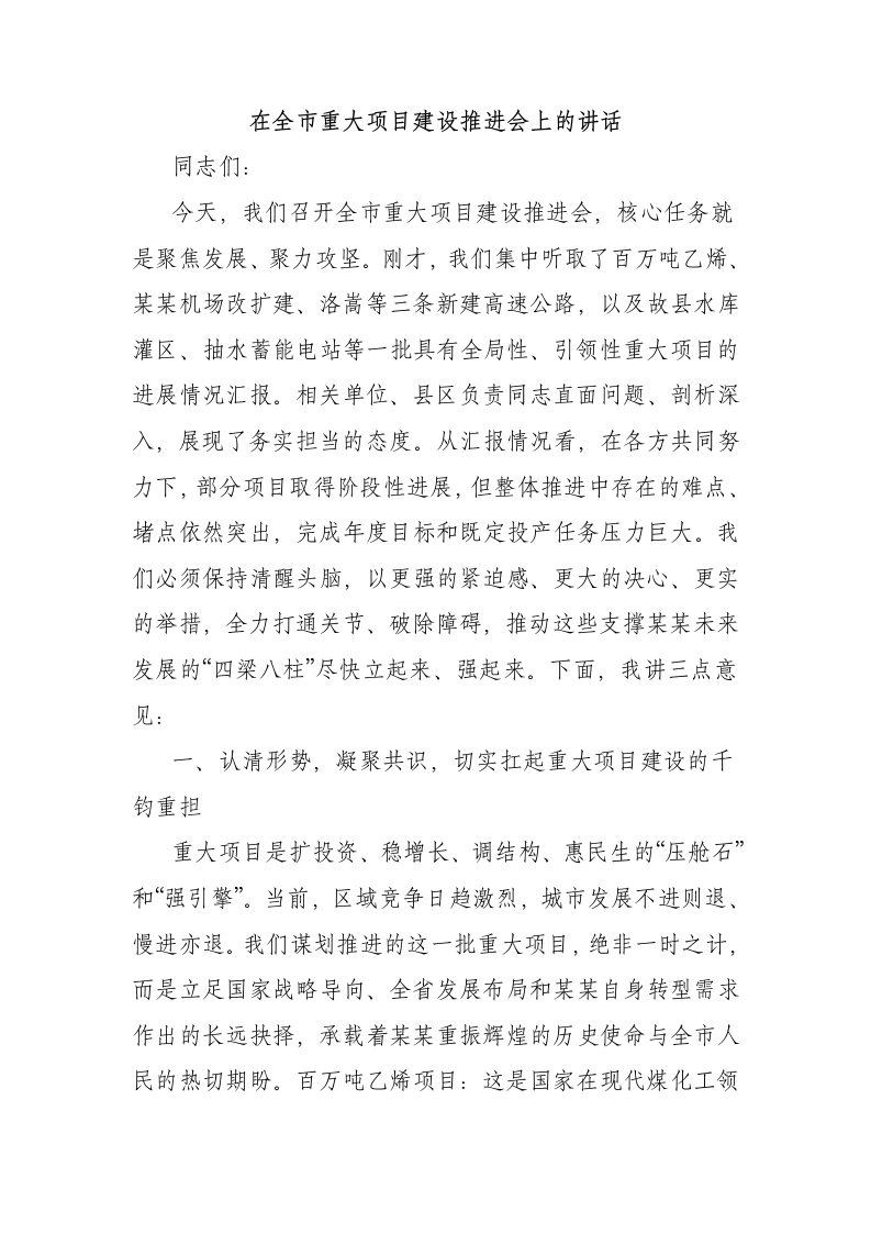 在全市重大项目建设推进会上的讲话同志们:今天,我们召开全市重大项目建设推进会,核心任务就是聚焦发展、聚力攻坚。刚才,我们集中听取了百万吨乙烯、某某机场改扩建、洛嵩等三条新建高速公路,以及故县水库灌区、抽水蓄能电站等一批具有全局性、引领性重大项目的进展情况汇报。相关单位、县区负责同志直面问题、剖析深入,展现了务实担当的态度。从汇报情况看,在各方共同努力下,部分项目取得阶段性进展,但整体推进中存在的难点、堵点依然突出,完成年度目标和既定投产任务压力巨大。我们必须保持清醒头脑,以更强的紧迫感、更大的决心、更实的举措,全力打通关节、破除障碍,推动这些支撑某某未来发展的“四梁八柱”尽快立起来、强起来。下面,我讲三点意见:一、认清形势,凝聚共识,切实扛起重大项目建设的千钧重担重大项目是扩投资、稳增长、调结构、惠民生的“压舱石”和“强引擎”。当前,区域竞争日趋激烈,城市发展不进则退、慢进亦退。我们谋划推进的这一批重大项目,绝非一时之计,而是立足国家战略导向、全省发展布局和某某自身转型需求作出的长远抉择,承载着某某重振辉煌的历史使命与全市人民的热切期盼。百万吨乙烯项目:这是国家在现代煤化工领域优化布局的关键落子,是省委、省政府赋予某某的“头号工程”,更是我市构建万亿级石化产业集群、挺起先进制造业脊梁的“定盘星”。项目总投资超600亿元,其意义不仅在于1500万吨炼油扩能改造与百万吨乙烯装置的强大产能,更在于它将以“油头化尾”为主线,强力拉伸产业链条,吸引集聚数百亿级的高端聚烯烃、高性能纤维、精细化工新材料等下游产业,彻底重塑某某石化产业版图,为我们打造全国重要的高端石化产业基地奠定不可撼动的基石。项目早一日建成投产,某某的产业能级就早一日实现质的飞跃。当前,项目已进入基建施工与长周期设备采购的关键期,时间窗口稍纵即逝,容不得半点懈怠。某某机场改扩建与三条高速公路项目:这是提升城市能级、重塑交通枢纽优势的“先手棋”。某某作为中原城市群副中心,交通枢纽功能弱化是制约我们融入新发展格局的明显短板。机场年旅客吞吐量早已远超原设计容量,扩建刻不容缓。洛嵩、嵩汝、嵩内三条高速,是加密我市高速路网、畅通与周边城市群联系、激活伏牛山生态旅游资源的关键通道。尤其是交旅融合的潜力巨大,一条路就能带动一片景区、富一方百姓。这些项目关乎某某能否真正成为“一带一路”重要节点和区域门户枢纽,关乎人流、物流、信息流、资金流的集聚效率。前期工作深度不足、投资主体未定、审批环节复杂等问题,是当前必须啃下的硬骨头。