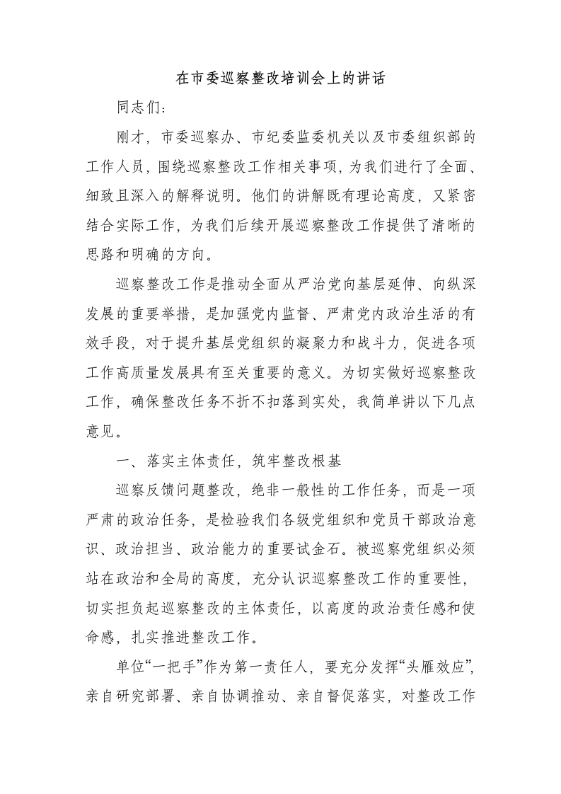 在市委巡察整改培训会上的讲话同志们:刚才,市委巡察办、市纪委监委机关以及市委组织部的工作人员,围绕巡察整改工作相关事项,为我们进行了全面、细致且深入的解释说明。他们的讲解既有理论高度,又紧密结合实际工作,为我们后续开展巡察整改工作提供了清晰的思路和明确的方向。巡察整改工作是推动全面从严治党向基层延伸、向纵深发展的重要举措,是加强党内监督、严肃党内政治生活的有效手段,对于提升基层党组织的凝聚力和战斗力,促进各项工作高质量发展具有至关重要的意义。为切实做好巡察整改工作,确保整改任务不折不扣落到实处,我简单讲以下几点意见。一、落实主体责任,筑牢整改根基巡察反馈问题整改,绝非一般性的工作任务,而是一项严肃的政治任务,是检验我们各级党组织和党员干部政治意识、政治担当、政治能力的重要试金石。被巡察党组织必须站在政治和全局的高度,充分认识巡察整改工作的重要性,切实担负起巡察整改的主体责任,以高度的政治责任感和使命感,扎实推进整改工作。单位“一把手”作为第一责任人,要充分发挥“头雁效应”,亲自研究部署、亲自协调推动、亲自督促落实,对整改工作负总责、负首责、负全责。要带头剖析问题根源,带头制定整改措施,带头抓好整改落实,以自身的模范行动引领带动整改工作深入开展。班子成员要严格落实“一岗双责”,既要抓好自身分管领域的业务工作,又要切实承担起分管领域反馈问题整改落实的责任。要主动靠前指挥,深入一线调研,加强对整改工作的指导和督促,确保分管领域整改工作不走过场、取得实效。乡镇党委在抓好本级反馈问题整改的同时,还要充分发挥承上启下的作用,切实加强对村(社区)反馈问题整改工作的督促、指导和审核。从之前审核的情况来看,有些地方存在对村(社区)反馈问题指导、督促不及时的问题。集中整改期快结束需要报送整改情况的时候,才匆匆忙忙对村(社区)的整改情况进行审核,导致报上来的村(社区)反馈问题整改情况质量较差,问题整改不彻底、不深入,甚至存在敷衍了事、弄虚作假的现象。这不仅影响了巡察整改工作的整体效果,也损害了党和政府在群众中的形象。今天参会的都是各被巡察单位的分管领导,你们是整改工作的具体组织者和推动者,责任重大、使命光荣。建议大家在接下来的集中整改期内,能够定期对巡察反馈问题整改情况进行调度和指导。通过召开专题会议、实地调研检查、听取工作汇报等方式,及时掌握整改工作进展情况,协调解决整改过程中遇到的困难和问题。同时,要同步落实好整改