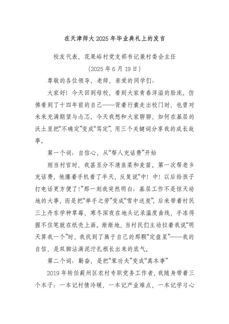 在天津师大2025年毕业典礼上的发言校友代表、花果峪村党支部书记兼村委会主任(2025年6月19日)尊敬的各位领导、老师,亲爱的同学们:大家好!今天回到母校,看到大家青春洋溢的脸庞,仿佛看到了十四年前的自己一背着行囊走出校门时,也曾对未来充满期望与忐忑。今天我想和大家聊聊,如何在基层的沃土里把“不确定”变成“笃定”,用三个关键词分享我的成长故事。第一个词:自信心,从“帮人充话费”开始刚当村官时,我甚至分不清韭莱和麦苗。第一次帮老乡充话费,他攥着手机看了半天,反复说“中!中!以后给孩子打电话更方便了!”那一刻我突然明白:基层工作不是惊天动地的大事,而是把“举手之劳”变成“雪中送炭”。后来带着村民三上丹东学种草莓,寒冬深夜在地头记录温度曲线,手冻得握不住笔就在纸壳上画。渐渐地,当村民们主动拉着我说“明天算我一个”时,我找到了属于自己的那颗“定盘星”一我的自信,是双脚沾满泥泞扎根长出来的底气。第二个词:勤奋,是把“笨功夫”变成“真本事”2019年转任蓟州区农村专职党务工作者,我随身带着三个本子:一本记村情冷暖,一本记产业难点,一本记学习心得。疫情期间西红柿滞销,有关部门帮我们开具了果蔬流通证明,镇里领导帮我们找销路,两委干部帮村民一起送货,最终共同度过难关。有次夜里大雪压塌大棚,我们打着手电筒抢救,笔记本上的数据至今还留着冰碴印儿。现在想来,基层的秘诀不在书斋而在地头,不在妙招而在实招一就像袁隆平院士说的,“书本里长不出水稻,只有田埂上才有答案第三个词:有所成,是让“小火花”燃成“满天星”十多年前,我牵头成立的草莓合作社只有5户村民。如今辐射200多个大棚,年产值突破2000万元。最让我骄傲的不是数字,而是去年春节回村,考上大学的孩子们围着我说:“我们暑假社会实践要回来上‘劳动课!”这让我想起老师和我说的一句话:“教育不是注满一桶水,而是点燃一团火。”在乡村振兴的战场上,我们的成就不在于种了多少亩地,而在于让更多人看见土地的价值、相信奋斗的力量。同学们,今天你们即将启程。如果哪天在田间地头摔了跤,别怕一那泥印子会变成你的勋章;如果遇到想不通的难题,试试看:把办公室搬到田间地头,把温暖送到老百姓的心头,把解决方案写在大地的皱褶卷头。这是母校教给我的,也是基层大地教给我的。最后,祝愿各位潜心耕耘、砥砺担当,绽放出无愧于时代的璀璨光芒!谢谢大家!