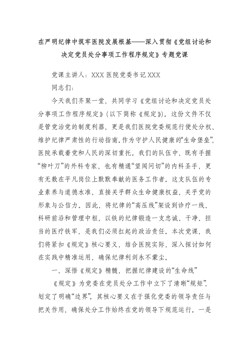 在严明纪律中筑牢医院发展根基一深入贯彻《党组讨论和决定党员处分事项工作程序规定》专题党课党课主讲人:XX医院党委书记XX同志们:今天我们齐聚一堂,共同学习《党组讨论和决定党员处分事项工作程序规定》(以下简称《规定》)。这份文件不仅是管党治党的制度利器,更是我们医院党委规范行使处分权、维护纪律严肃性的行动指南。作为守护人民健康的生命堡垒”,医院承载着党和人民的深切重托。我们的队伍中,既有手握“柳叶刀”的外科专家,也有精通“望闻问切”的内科圣手,更有无数在平凡岗位上默默奉献的医务工作者。这支队伍的专业素养与道德水准,直接关乎群众生命健康权益,关乎党的形象与公信力。因此,将纪律的“高压线”架设到诊疗一线、科研前沿和管理中枢,以铁的纪律锻造一支忠诚、干净、担当的医疗铁军,是我们必须扛起的政治责任。本次党课,我们将紧扣《规定》核心要义,结合医院实际,深入探讨如何在实践中精准运用,确保纪律利剑永不蒙尘。一、深悟《规定》精髓,把握纪律建设的“生命线”《规定》为党委在党员处分工作中立下了清晰“规矩”划定了明确“边界”。其核心要义在于强化党委的领导责任与把关作用,确保处分工作始终在党的领导下规范运行。一是强化主体责任意识,院党委必须挺膺担当,切实履行全面从严治党主体责任。对党员违纪问题,不能“讳疾忌医”,不能搞“一团和气”更不能“高举轻放。要以对党、对事业、对同志高度负责的态度,敢于较真碰硬,依规依纪作出处分决定。党委书记作为第一责任人,必须亲自抓、负总责。二是坚持民主集中制原则,《规定》明确要求处分决定必须经过党委集体讨论。这绝非“走形式”,而是集思广益、科学决策、防止偏差的根本保证。每位党委委员都要本着对组织、对事实、对同志负责的精神,充分发表意见,独立行使表决权,最终按照少数服从多数的原则形成决定。任何个人无权擅自决定或改变集体决议。三是恪守程序正义原则,程序是实体的保障,从线索处置、初步核实、立案审查,到审理、讨论决定、批准和执行,《规定》构建了一套严密闭环。程序上的任何一步“偷工减料”都可能侵蚀纪律的权威与公正。我们必须像严格执行医疗操作规程一样,一丝不苟地遵循处分程序,确保每一步都经得起检验。二、聚焦医疗行业风险,亮明纪律处分的“警示牌”医院并非“无菌环境”,廉洁风险点如同潜在的“病灶”时刻考验着党员干部的免疫力,我们必须清醒认识并高度警惕。一是“红包回扣”顽疾,某些人员利用处方权、诊疗建议权、耗材设备选择权等,收受患者及家属“红包”,或与医药代表