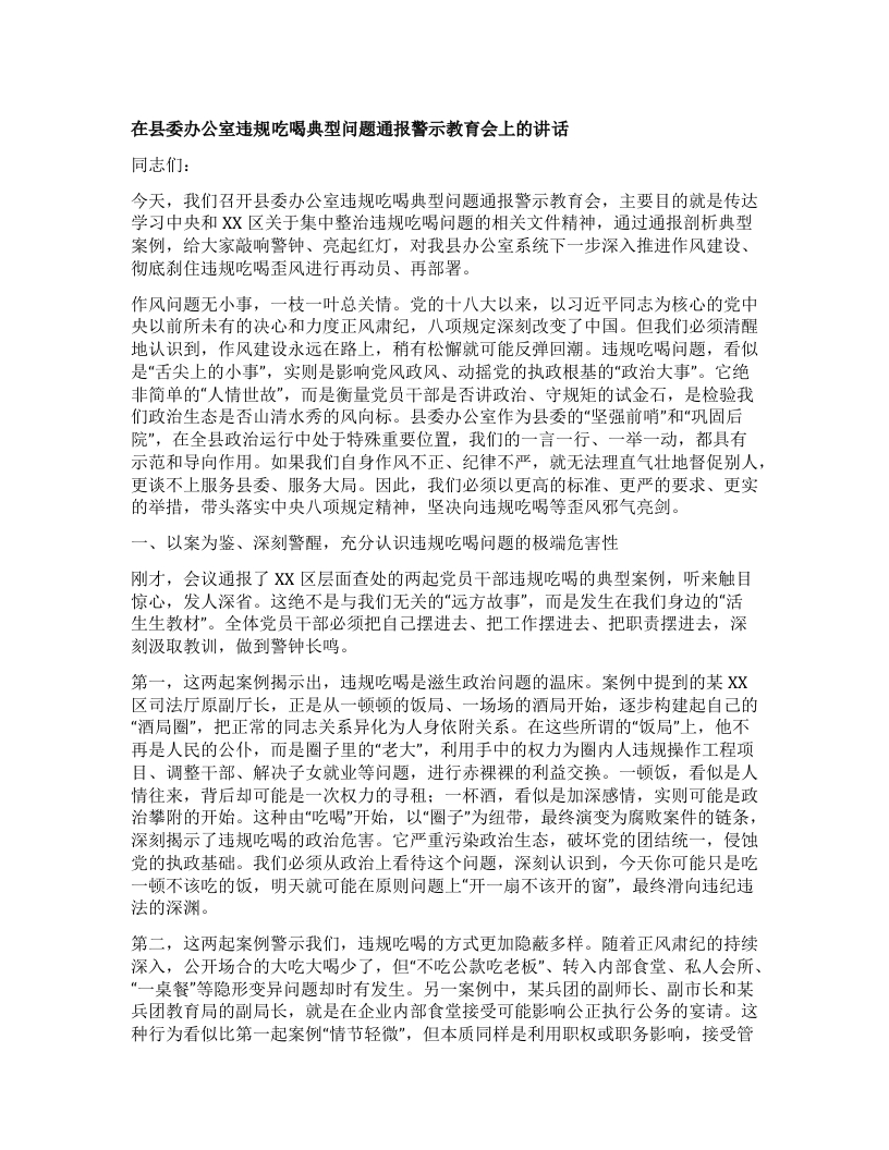 【团队精品】在县委办公室违规吃喝典型问题通报警示教育会上的讲话