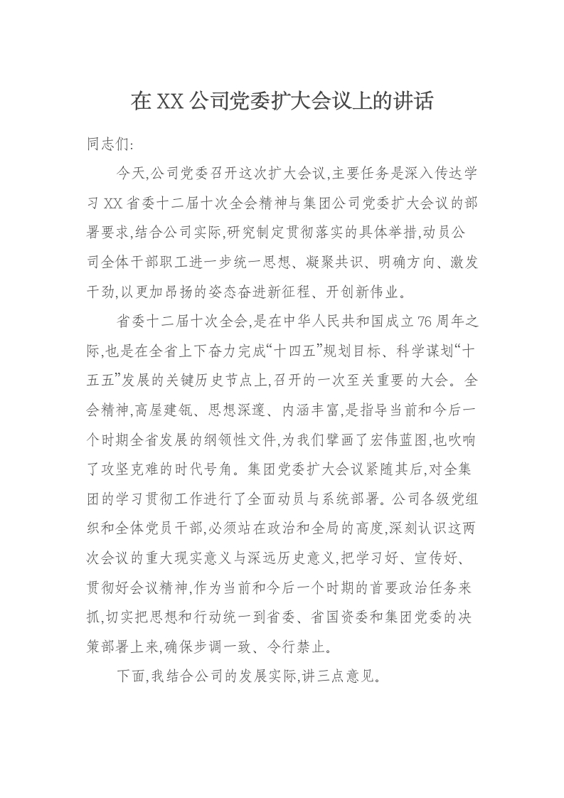 在XX公司党委扩大会议上的讲话