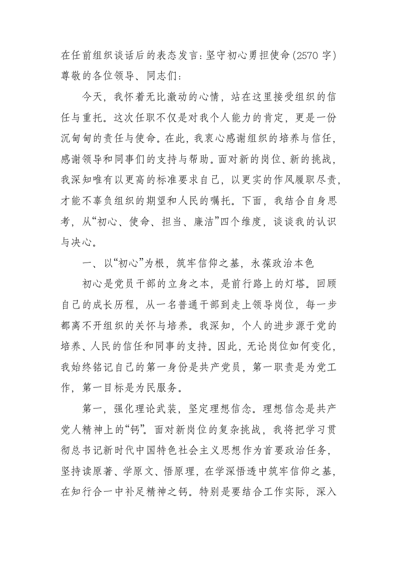 在任前组织谈话后的表态发言:坚守初心勇担使命(2570字)