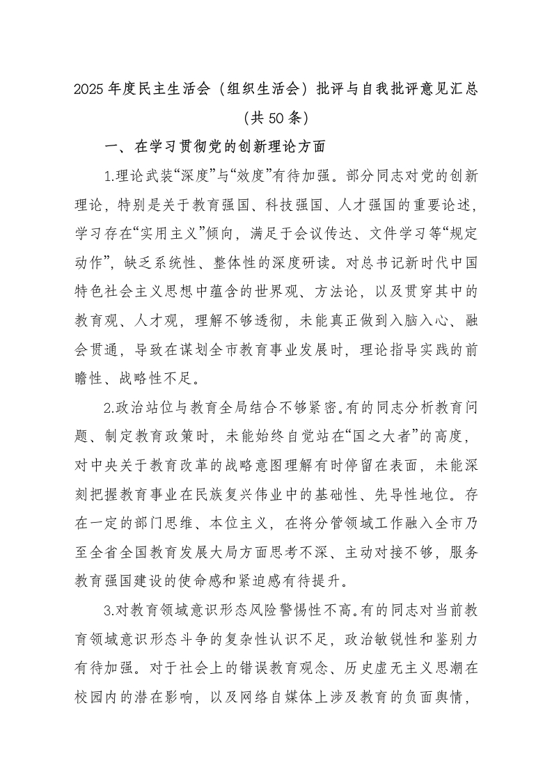 2025年度民主生活会(组织生活会)批评与自我批评意见汇总(共50条)一、在学习贯彻党的创新理论方面1.理论武装“深度”与“效度”有待加强。部分同志对党的创新理论,特别是关于教育强国、科技强国、人才强国的重要论述,学习存在“实用主义”倾向,满足于会议传达、文件学习等“规定动作”,缺乏系统性、整体性的深度研读。对总书记新时代中国特色社会主义思想中蕴含的世界观、方法论,以及贯穿其中的教育观、人才观,理解不够透彻,未能真正做到入脑入心、融会贯通,导致在谋划全市教育事业发展时,理论指导实践的前瞻性、战略性不足。2.政治站位与教育全局结合不够紧密。有的同志分析教育问题、制定教育政策时,未能始终自觉站在“国之大者”的高度,对中央关于教育改革的战略意图理解有时停留在表面,未能深刻把握教育事业在民族复兴伟业中的基础性、先导性地位。存在一定的部门思维、本位主义,在将分管领域工作融入全市乃至全省全国教育发展大局方面思考不深、主动对接不够,服务教育强国建设的使命感和紧迫感有待提升。3.对教育领域意识形态风险警惕性不高。有的同志对当前教育领域意识形态斗争的复杂性认识不足,政治敏锐性和鉴别力有待加强。对于社会上的错误教育观念、历史虚无主义思潮在校园内的潜在影响,以及网络自媒体上涉及教育的负面舆情,有时反应不够及时,未能旗帜鲜明地进行有效引导和批驳,存在怕惹麻烦、怕担风险的“避责”心态,在教育阵地上守土尽责、主动发声的意识需进一步强化。4.学用结合转化能力存在短板。部分同志理论学习成果向教育实践转化的渠道不够畅通,存在“学归学、做归做”的现象。运用党的创新理论破解教育发展难题,如深化教育评价改革、推动“双减”政策行稳致远、促进义务教育优质均衡发展、职业教育产教融合、高等教育内涵式发展等方面的思路不够开阔,举措创新性不足,未能将新思想新理念有效转化为推动我市教育高质量发展的具体路径和生动实践。二、在贯彻执行中央决策部署和上级要求方面5.政策执行存在“温差“偏差”。在落实党中央、国务院及省委省政府关于教育的重大决策部署时,有时存在机械执行、照搬照套的情况,未能紧密结合我市经济社会发展实际、教育发展现状进行创造性转化和精细化落实。例如,在推进教育数字化转型、优化区域教育资源配置、规范民办义务教育发展等工作中,因地制宜、精准施策的能力有待提高,导致部分政策红利未能充分释放,基层学校和师生获得感不强。6,对教育宏观战略的前瞻性把握不足。部分同志对新发展阶段教育面临的新形势、新挑战研究不够深入,对人口结构变化、科技革命影响、社会需求变迁等给教育带来的深远影响预判不足。在谋划“十五五”教育发展规划、布局未来教育发展新赛道