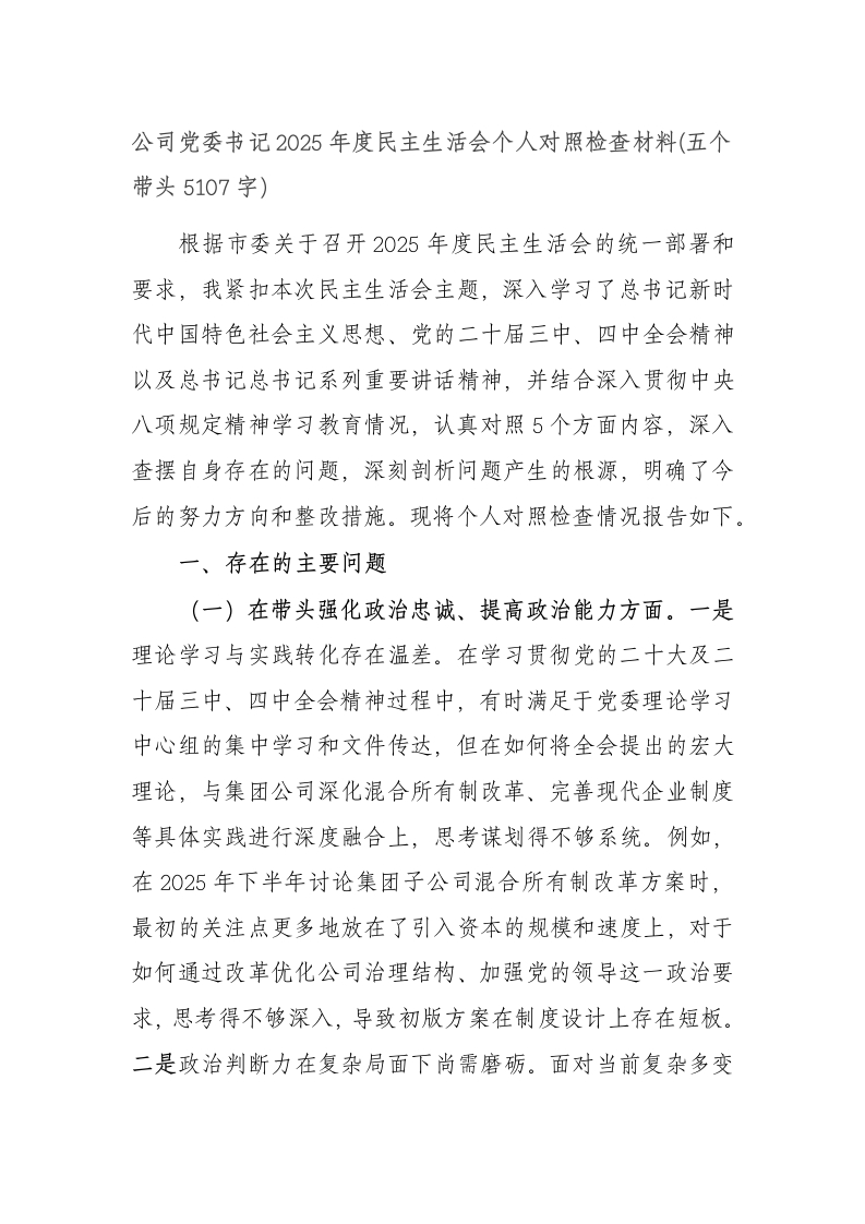 公司党委书记2025年度民主生活会个人对照检查材料(五个带头5107字)根据市委关于召开2025年度民主生活会的统一部署和要求,我紧扣本次民主生活会主题,深入学习了总书记新时代中国特色社会主义思想、党的二十届三中、四中全会精神以及总书记总书记系列重要讲话精神,并结合深入贯彻中央八项规定精神学习教育情况,认真对照5个方面内容,深入查摆自身存在的问题,深刻剖析问题产生的根源,明确了今后的努力方向和整改措施。现将个人对照检查情况报告如下。一、存在的主要问题(一)在带头强化政治忠诚、提高政治能力方面。一是理论学习与实践转化存在温差。在学习贯彻党的二十大及二十届三中、四中全会精神过程中,有时满足于党委理论学习中心组的集中学习和文件传达,但在如何将全会提出的宏大理论,与集团公司深化混合所有制改革、完善现代企业制度等具体实践进行深度融合上,思考谋划得不够系统。例如,在2025年下半年讨论集团子公司混合所有制改革方案时,最初的关注点更多地放在了引入资本的规模和速度上,对于如何通过改革优化公司治理结构、加强党的领导这一政治要求,思考得不够深入,导致初版方案在制度设计上存在短板。二是政治判断力在复杂局面下尚需磨砺。面对当前复杂多变的宏观经济形势和地方政府债务化解的艰巨任务,有时会不自觉地陷入具体业务的细节之中,从政治高度上审视和判断重大问题的敏锐性有待加强。譬如,今年上半年在评估一个大型城市片区开发项目时,项目团队提交的可行性报告主要聚焦于经济效益和投资回报率,我虽然感觉项目融资方案存在一定风险,但未能第一时间从防范化解重大金融风险、维护社会稳定大局的政治高度提出明确的预警和调整意见,直至后续经过多轮讨论,才最终将项目的社会效益和风险防控置于优先位置。三是政治执行力在贯通到底上存在堵点。对中央的大政方针和省市委的决策部署,能够做到坚决拥护、迅速部署,但在推动政策要求在集团各层级、各业务板块不折不扣地落地见效方面,穿透力尚有不足。例如,中央反复强调严控新增地方政府隐性债务,集团也出台了相应的制度规定。但在今年对燃区新型城镇化项目的融资方案进行评审时,我对一个由下属公司上报的、带有“名股实债”嫌疑的融资模式未能立即识别并予以制止,反映出在将宏观政策要求转化为具体项目审核标准的执行过程中,还存在一定的盲区和短板。(二)在带头固本培元、增强党性方面。一是党性锤炼融入日常工作不够紧密。能够充分认识到加强党性修养的重要性,并积极参加各类党性教育活动。但在日常工作中,特别是在业务繁忙、任务繁重的时候,有时会不自觉地出现“重