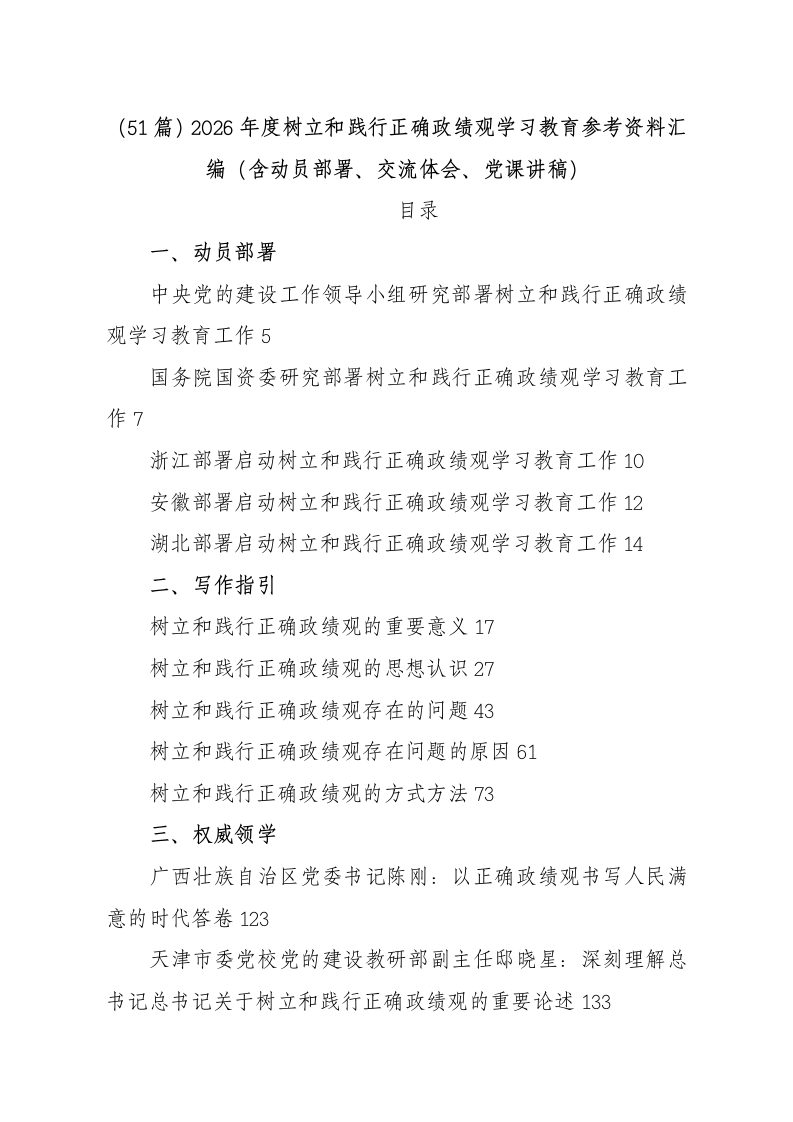 (51篇)2026年度树立和践行正确政绩观学习教育参考资料汇编(含动员部署、交流体会、党课讲稿)目录一、动员部署中央党的建设工作领导小组研究部署树立和践行正确政绩观学习教育工作5国务院国资委研究部署树立和践行正确政绩观学习教育工作7浙江部署启动树立和践行正确政绩观学习教育工作10安徽部署启动树立和践行正确政绩观学习教育工作12湖北部署启动树立和践行正确政绩观学习教育工作14二、写作指引树立和践行正确政绩观的重要意义17树立和践行正确政绩观的思想认识27树立和践行正确政绩观存在的问题43树立和践行正确政绩观存在问题的原因61树立和践行正确政绩观的方式方法73三、权威领学广西壮族自治区党委书记陈刚:以正确政绩观书写人民满意的时代答卷123天津市委党校党的建设教研部副主任邸晓星:深刻理解总书记总书记关于树立和践行正确政绩观的重要论述133总书记经济思想研究中心副主任李玉举:政绩观纠偏与能力重塑:干部高质量发展本领的时代要求140中央统战部研究室处吴桂韩:以正确政绩观推动高质量发展151哈尔滨师范大学马克思主义学院院长刘爱军:坚持以正确政绩观推动黑龙江高质量发展161四、专家访谈专访:如何树牢和践行正确政绩观168专访:牢固树立和践行正确政绩观178专访:树牢为民造福的政绩观190五、学习交流海南省人大常委会内务司法工作委员会内务处处长李桂青:践行正确政绩观答好自贸港建设人大卷200中央组织部研究室部刊处二级巡视员葛立鹏:牢固树立和践行正确政绩观204天津市财政局党组:牢固树立和践行正确政绩观为全市发展大局贡献财政力量210天津市委党校常越:领导干部要树立和践行正确政绩观215青海省委宣传部机关党委专职副书记:从优秀传统文化中汲取修身的智慧牢固树立和践行正确政绩观227济宁市委组织部部长庞建栋:带头树立和践行正确政绩观234