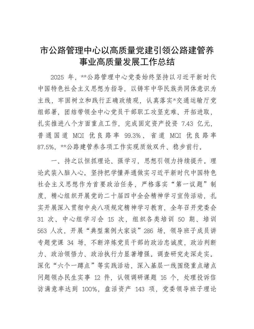 市公路管理中心以高质量党建引领公路建管养事业高质量发展工作总结2025年,*公路管理中心党委始终坚持以习近平新时代中国特色社会主义思想为指导,以铸牢中华民族共同体意识为主线,牢固树立和践行正确政绩观,认真落实*交通运输厅党组部署,团结带领全中心党员干部职工攻坚克难、开拓进取,扎实推进八个方面重点工作,完成固定资产投资7.43亿元,普通国道MOI优良路率99.3%、省道MQI优良路率87.5%,*公路建管养各项工作实现质效双升、稳步前行。一、持之以恒抓理论、强学习,思想引领力持续提升。理论武装入脑入心。坚持把学懂弄通做实习近平新时代中国特色社会主义思想作为首要政治任务,严格落实“第一议题”制度,精心组织开展党的二十届四中全会精神学习宣传活动,扎实开展深入贯彻中央八项规定精神学习教育,全年召开党委会31次、中心组学习会15次,组织各类培训50期、培训563人次,开展“典型案例大家谈”286场,领导班子成员讲专题党课34场,不断淬炼党员干部的政治忠诚度,政治判断力、政治领悟力、政治执行力显著增强。调查研究走深走实。深化“六个一蹲点”等实践活动,深入基层一线围绕重点堵点问题领办民生实事12件,认领调研课题16个,处理投诉信访满意率达到100%,盘活资产143项,党委领导班子理论