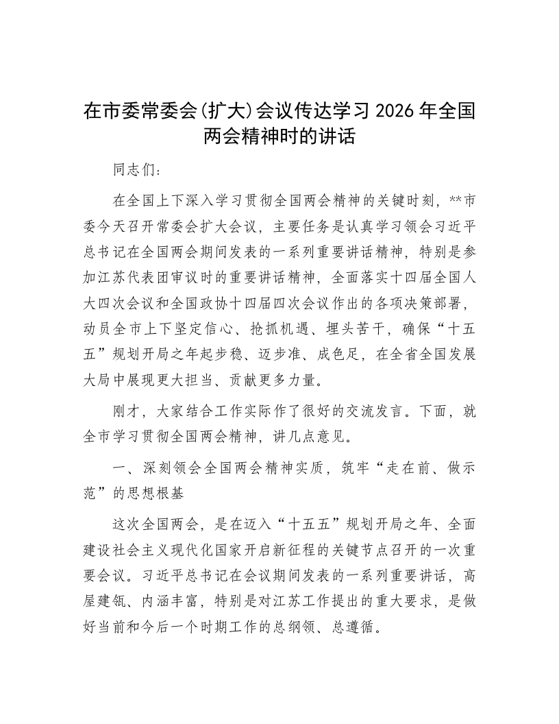 在市委常委会(扩大)会议传达学习2026年全国两会精神时的讲话同志们:在全国上下深入学习贯彻全国两会精神的关键时刻,*市委今天召开常委会扩大会议,主要任务是认真学习领会习近平总书记在全国两会期间发表的一系列重要讲话精神,特别是参加江苏代表团审议时的重要讲话精神,全面落实十四届全国人大四次会议和全国政协十四届四次会议作出的各项决策部署,动员全市上下坚定信心、抢抓机遇、埋头苦干,确保“十五五”规划开局之年起步稳、迈步准、成色足,在全省全国发展大局中展现更大担当、贡献更多力量。刚才,大家结合工作实际作了很好的交流发言。下面,就全市学习贯彻全国两会精神,讲几点意见。一、深刻领会全国两会精神实质,筑牢“走在前、做示范”的思想根基这次全国两会,是在迈入“十五五”规划开局之年、全面建设社会主义现代化国家开启新征程的关键节点召开的一次重要会议。习近平总书记在会议期间发表的一系列重要讲话,高屋建瓴、内涵丰富,特别是对江苏工作提出的重大要求,是做好当前和今后一个时期工作的总纲领、总遵循。