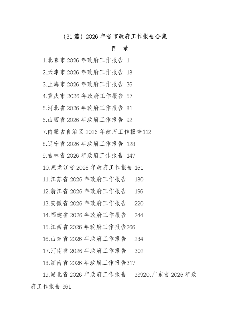 (31篇)2026年省市政府工作报告合集目录1.北京市2026年政府工作报告12.天津市2026年政府工作报告183.上海市2026年政府工作报告364.重庆市2026年政府工作报告575.河北省2026年政府工作报告816.山西省2026年政府工作报告927.内蒙古自治区2026年政府工作报告1128.辽宁省2026年政府工作报告1289.吉林省2026年政府工作报告14710.黑龙江省2026年政府工作报告16111.江苏省2026年政府工作报告18012.浙江省2026年政府工作报告19613.安徽省2026年政府工作报告22014.福建省2026年政府工作报告24415.江西省2026年政府工作报告26616.山东省2026年政府工作报告28417.河南省2026年政府工作报告30218.湖南省2026年政府工作报告31719.湖北省2026年政府工作报告33920.广东省2026年政府工作报告361