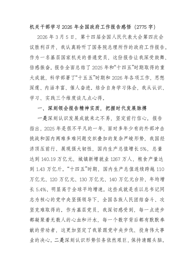 机关干部学习2026年全国政府工作报告感悟(2775字)