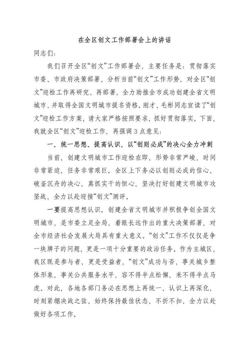 我们召开全区“创文”工作部署会,主要任务是:贯彻落实市委、市政府决策部署,分析当前“创文”工作形势,对全区“创文”迎检工作再研究、再部署,全力助推全市成功创建全省文明城市,并取得全国文明城市提名资格。刚才,毛彬同志宣读了“创文”迎检工作方案,请大家严格按照要求,抓好贯彻落实。下面,我就全区“创文”迎检工作,再强调3点意见: